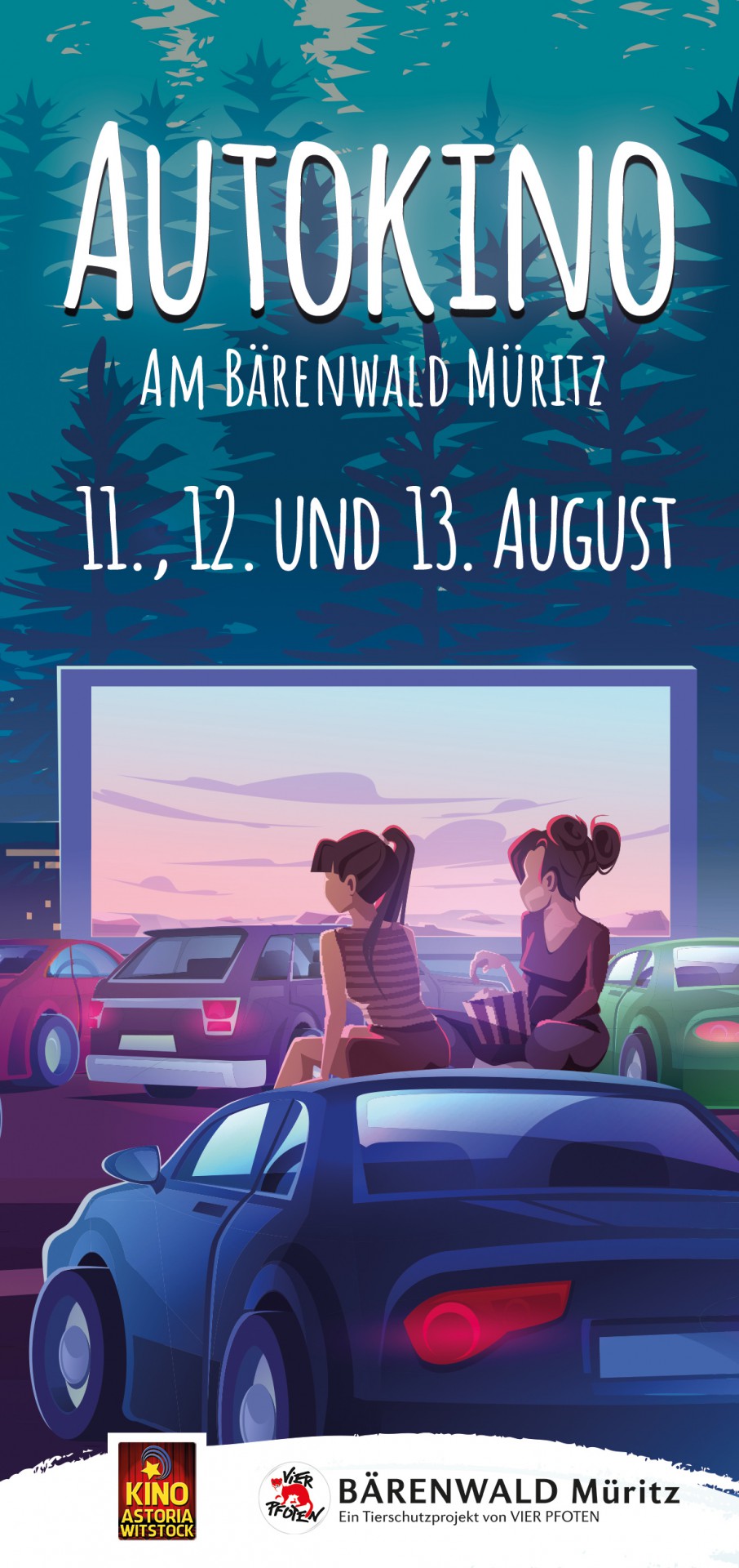 Film ab! heißt es erstmals am BÄRENWALD Müritz in Stuer. Der große Besucherparkplatz gegenüber der Tierschutzeinrichtung wird sich an drei Abenden im August in ein Autokino verwandeln. Das Gemeinschaftsprojekt des Kino Astoria Wittstock und des BÄRENWALDES Müritz soll die touristische Angebotspalette in der Mecklenburgischen Seenplatte bereichern und zeigen, dass besondere gemeinsame Erlebnisse auch in Corona-Zeiten möglich sind – natürlich unter Beachtung der notwendigen Sicherheitsstandards.