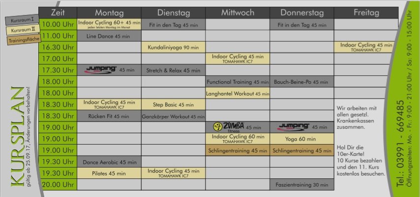 Egal ob Line Dance, Zumba, Indoor Cycling, Rücken Fit Pialtes, Kundaliniyoga, Ganzkörper Workout oder Schlingentraining – die Schweißtropfen werden nicht lange auf sich warten lassen.