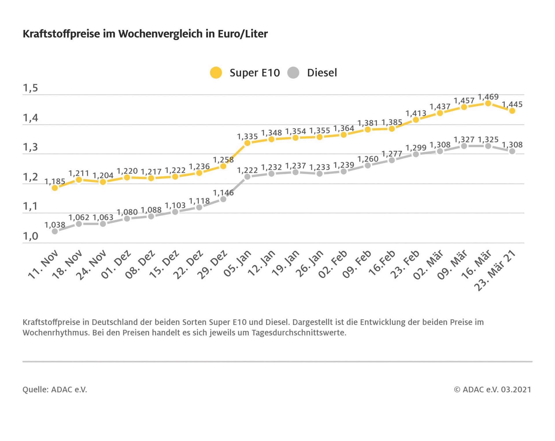 Erstmals seit Anfang Dezember 2020 ist der Benzinpreis im Vergleich zur Vorwoche gesunken. Das zeigt die aktuelle ADAC Auswertung der Kraftstoffpreise in Deutschland. Für einen Liter Super E10 müssen die Autofahrer im bundesweiten Mittel derzeit 1,445 Euro bezahlen, das sind 2,4 Cent weniger als vor einer Woche. Im selben Zeitraum ist auch Diesel-Kraftstoff billiger geworden. Ein Liter kostet aktuell im Schnitt 1,308 Euro – ein Minus von 1,7 Cent je Liter.