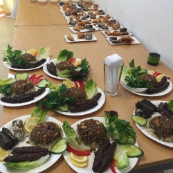 Kl8Stunden wurden in die Vorbereitungen investiert, sogar ein Lamm zubereitet. Berge von Salat, Fallafel, köstlichen Pasten sowie leckere Süßspeisen von Milchreis bis Baklawan verwöhnten die Gaumen der Klinker.