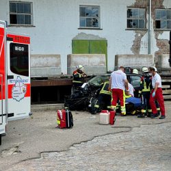 Dramatischer Unfall heute Mittag in Waren: Eine 74 Jahre alte Autofahrerin ist vermutlich wegen gesundheitlicher Probleme auf dem alten GHG-Gelände in der Witzlebenstraße mit ziemlich hoher Geschwindigkeit gegen einen dort abgestellten alten Traktor gekracht.