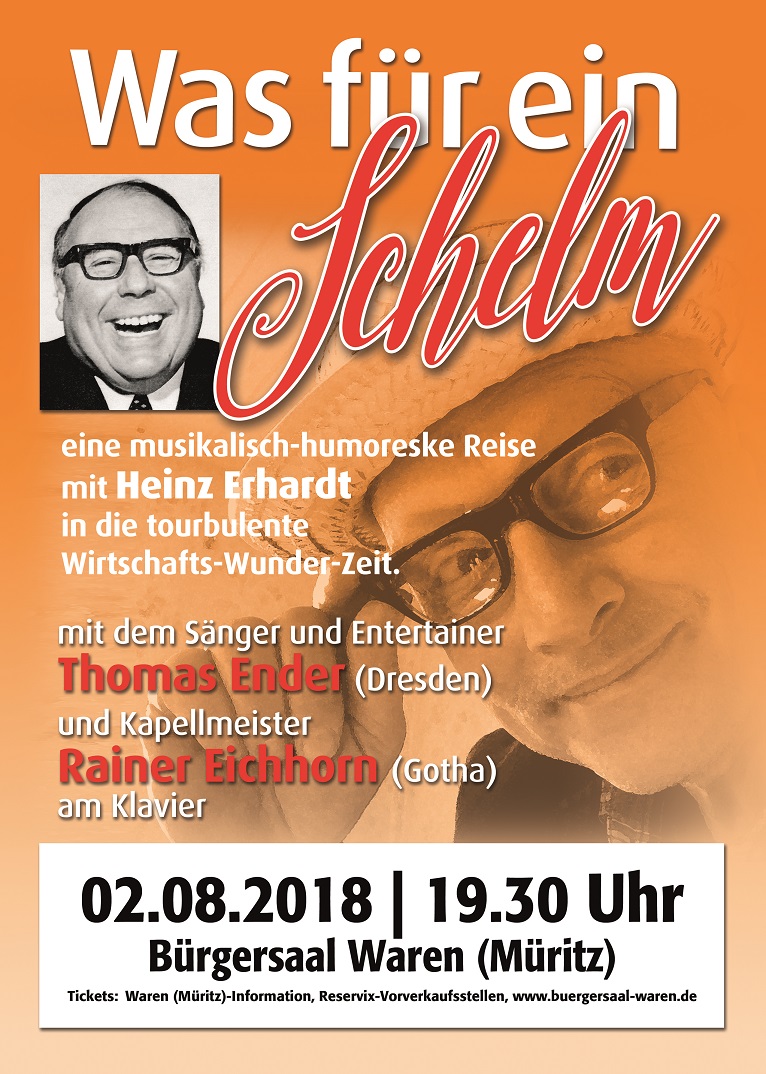 Während einer musikalisch-humoresken Reise u.a. mit peppigen Schlagern und Sketchen durch die turbulente Wirtschaftswunder-Zeit erleben Sie den Charakterbariton Thomas Ender, der mit außergewöhnlichem schauspielerischen Talent den schwarzen Humor und Wortwitz des großen Heinz Erhardt interpretiert, ohne ihn kopieren zu wollen.