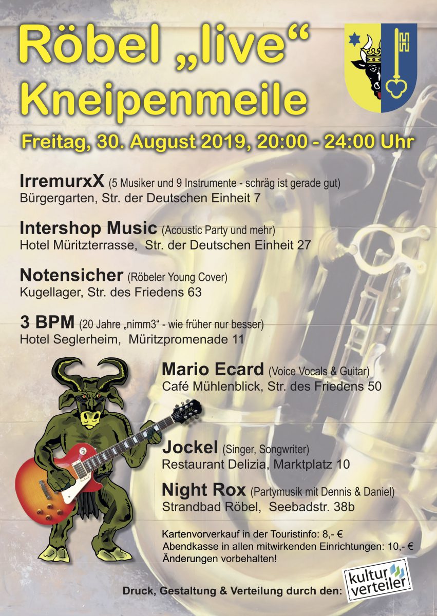 Am kommenden Freitag, 30. August, geht Röbel LIVE – die musikalische Kneipenmeile – nun schon zum 10. Mal an den Start. Bei „Wir sind Müritzer“ könnten Sie heute zweimal zwei Freikarten für dieses Event – organisiert von Mitarbeitern der Stadt – gewinnen.