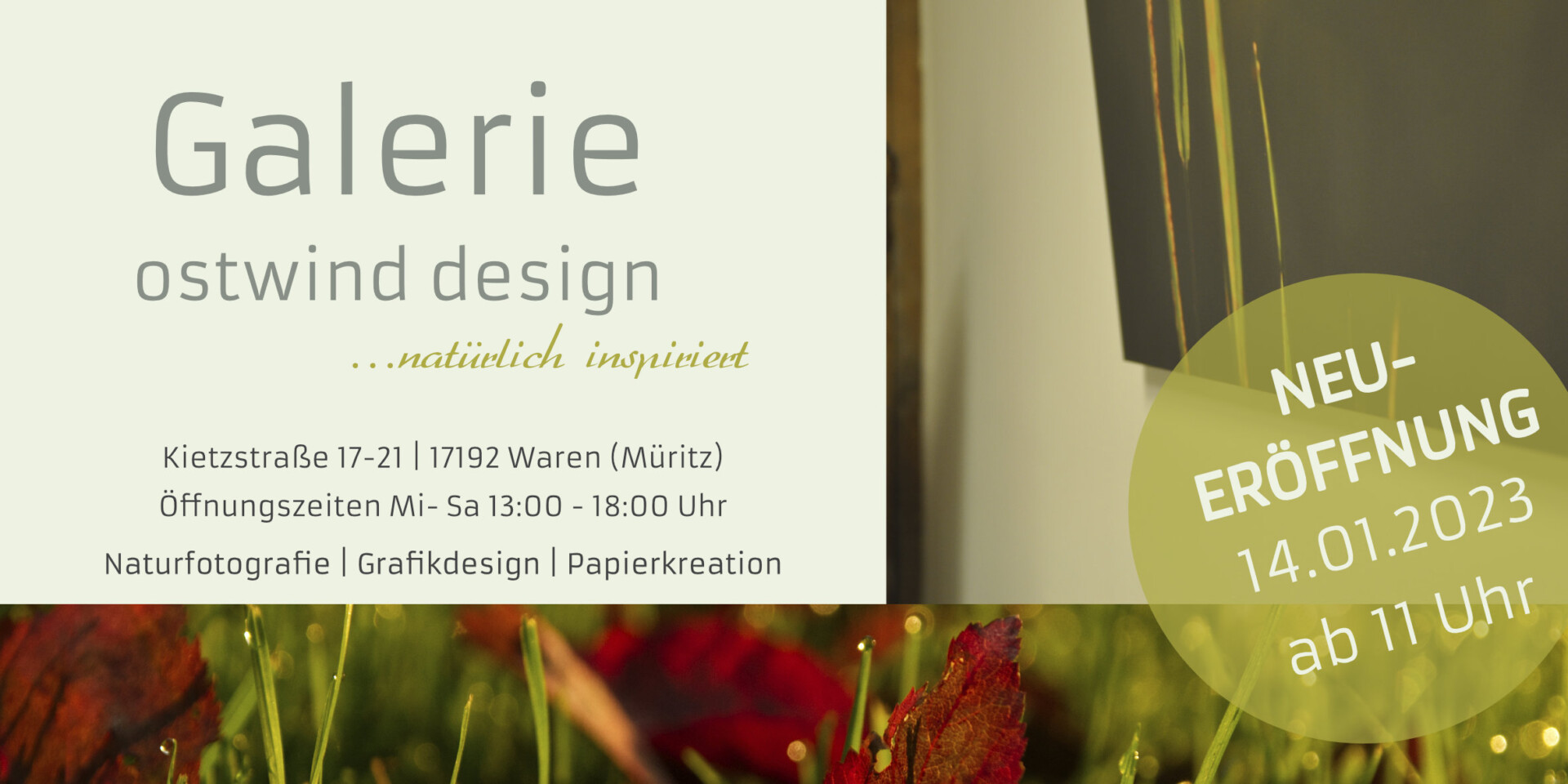 Das Warener Designbüro nimmt mit dem Jahreswechsel einen neuen Kurs auf. Natürlich-Intuitiv. Mit Eröffnung der Galerie ostwind design im Herzen von Waren bringt die Grafik- und Fotodesignerin Anja Puder natürliche Inspiration in die Kietzpassage. Zu entdecken gibt es hier ab dem morgigen Sonnabend feinfühlige Naturmotive, Fotoideen zur Wandgestaltung, Papierkreationen und einiges mehr. Vorbeischauen lohnt sich