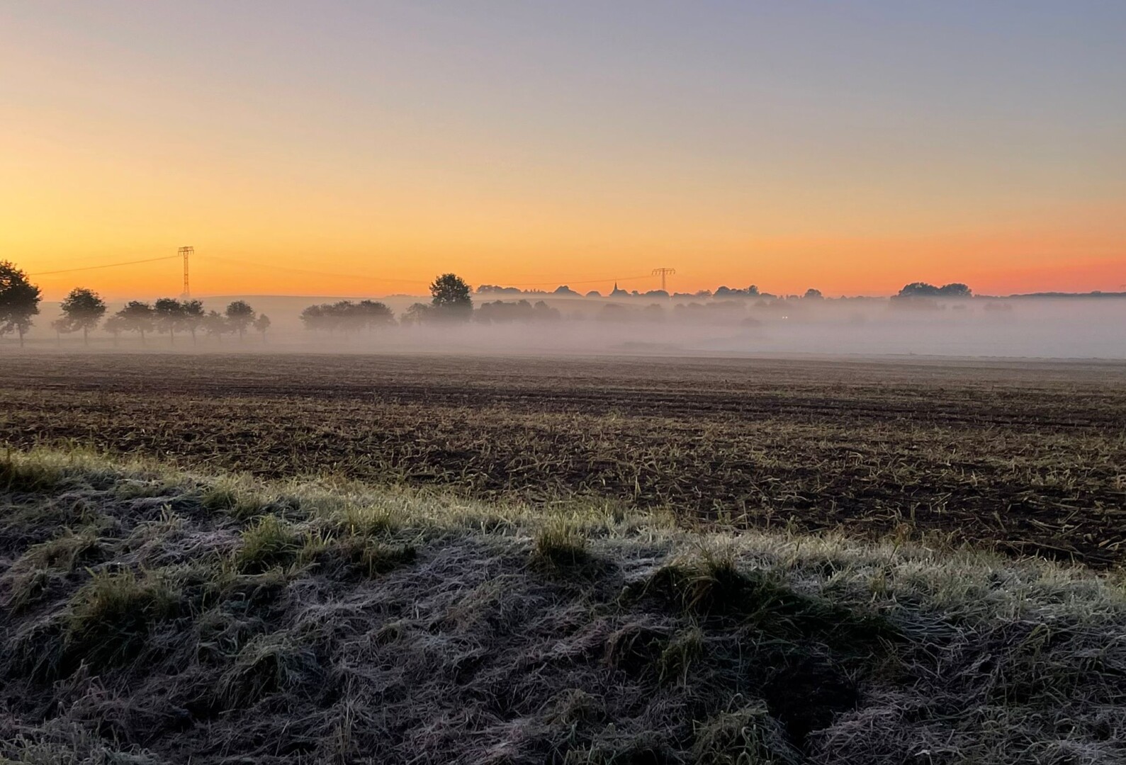 Ein wunderschöner herbstlicher Tagesanfang heute in der Müritz-Region wie hier in Sietow Dorf mit Reif auf den Wiesen und Nebel über den Feldern zum Sonnenaufgang.