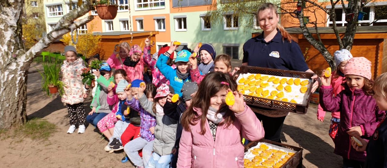 Voller Eifer und Tatendrang legten die Kinder Beete an, bepflanzten die zuvor gestalteten Blumen-Reifen, harkten, fegten und gestalteten den Garten der Kita wunderschön. Da kam die Überraschung der Mecklenburger Backstuben gerade recht, denn jedes Kind bekam ein Ostereigebäck.