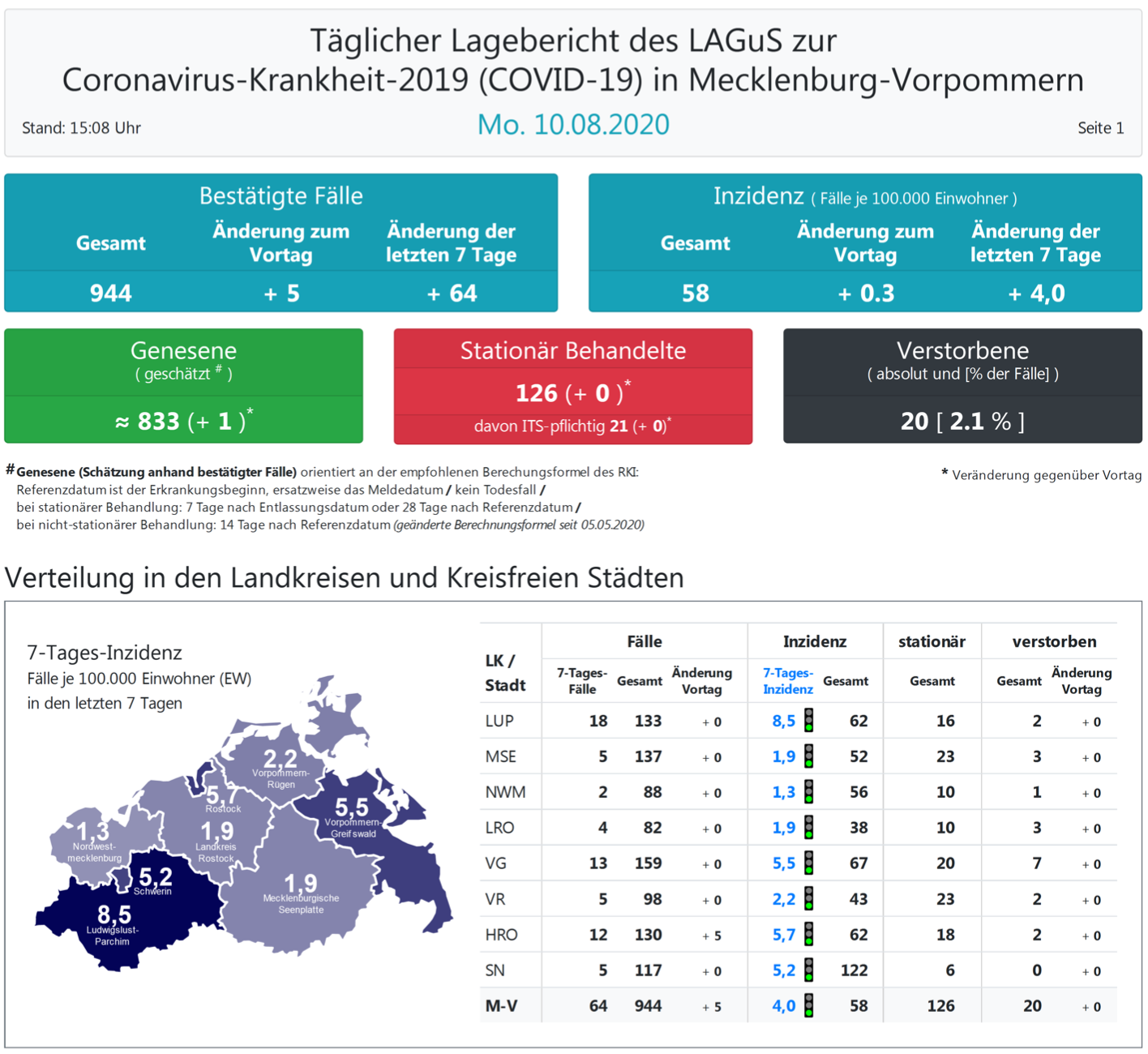 Laut einer Schätzung des Robert Koch-Instituts (RKI) sind in Mecklenburg-Vorpommern 833 (+1) der positiv getesteten Menschen von einer Covid-19-Erkrankung genesen. Insgesamt gab es bislang 20 Todesfälle im Land. I