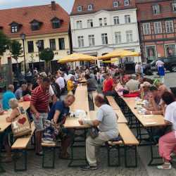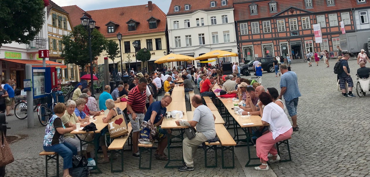 Bereits zum 15. Mal organisierte die „Warener Tafel“ diese lange Tafel im Zentrum der Warener Innenstadt, um die Tafelidee vorzustellen und zu „leben“, aber auch, um Tafelnutzer und Tafel-Nichtnutzer an einen Tisch zu bringen.