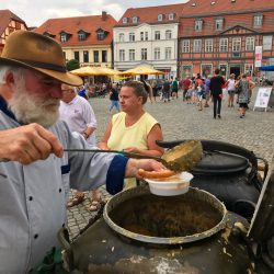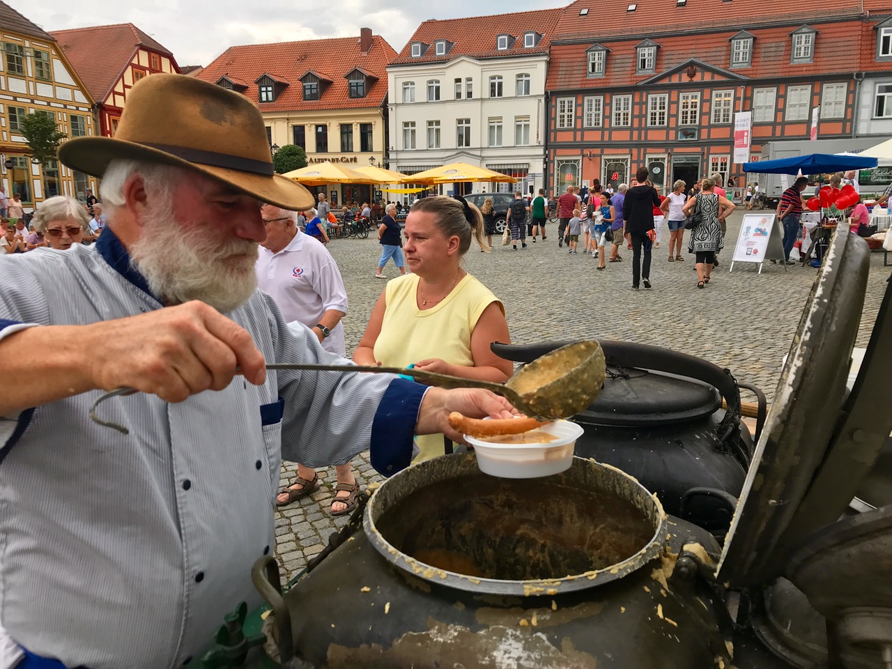 Da sag‘ noch einer, deftiger Erbseneintopf mit Würstchen schmeckt nur im Winter. Nein, auch bei 30 Grad im Schatten konnte sich Klaus Fabisch mit seiner Gulaschkanone heute auf dem Neuen Markt über mangelnde Kundschaft nicht beklagen.