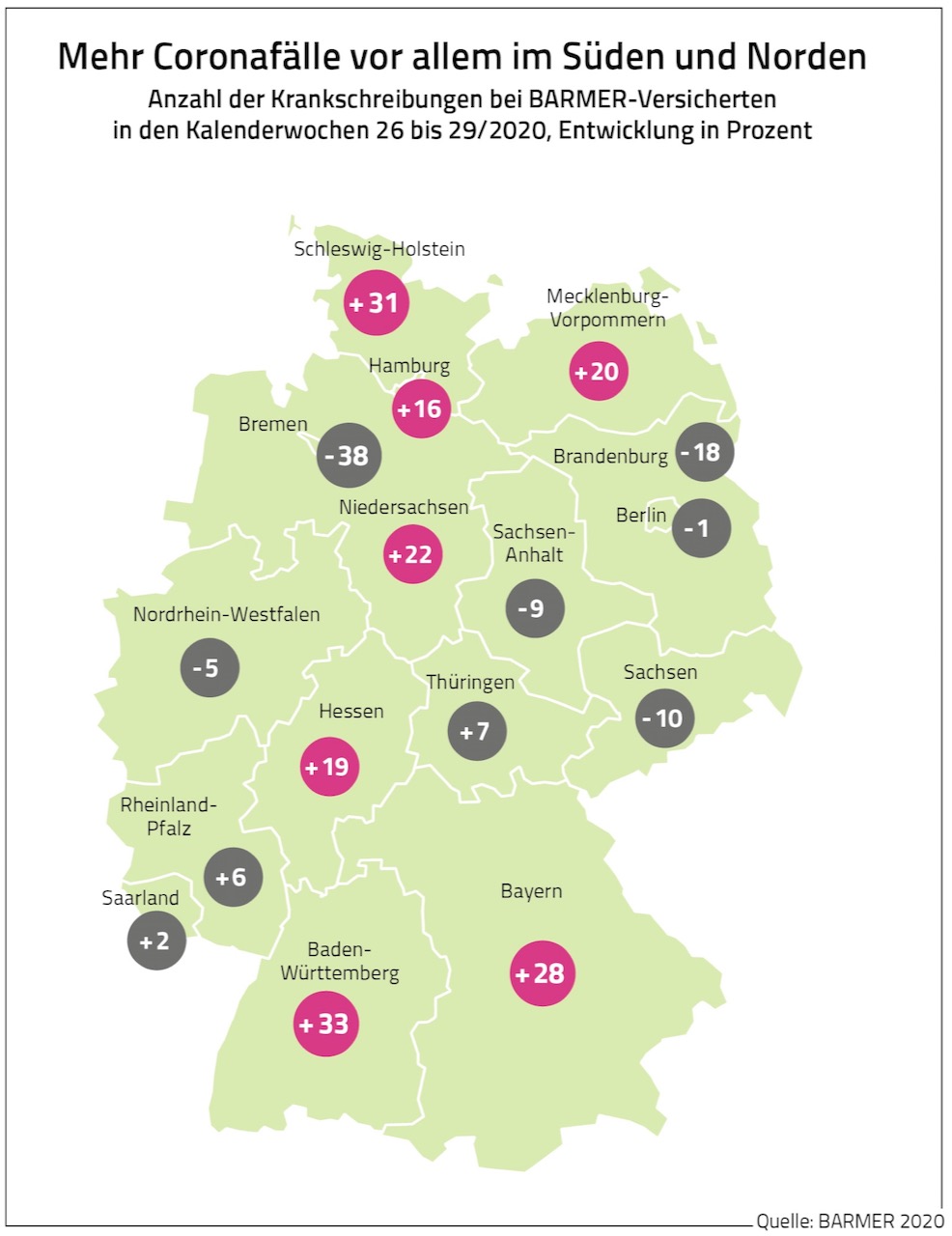 Die Gesamtzahlen der Corona-Krankschreibungen haben sich den Ergebnissen der Auswertung zufolge regional sehr unterschiedlich entwickelt. In Mecklenburg-Vorpommern stieg die Zahl der Krankschreibungen von der 26. bis zur 29. Kalenderwoche über alle Altersklassen hinweg um 20 Prozent (von 40 auf 48 Betroffene).