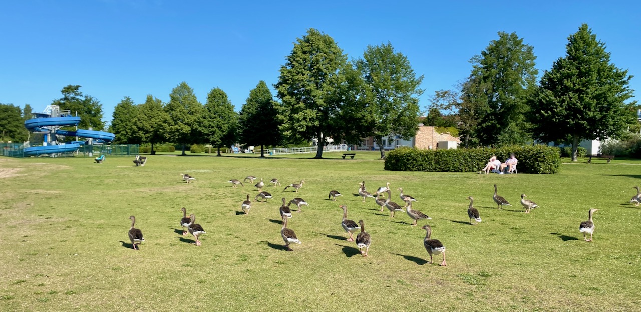 Morgens halb neun am Warener Volksbad: Die gefiederten Strandfreunde lassen sich auch von den ersten Badegästen nicht stören, drehen gemütlich ihre Runden und schauen sich neugierig die abgelegten Sachen und Handtücher der Volksbad-Besucher an.