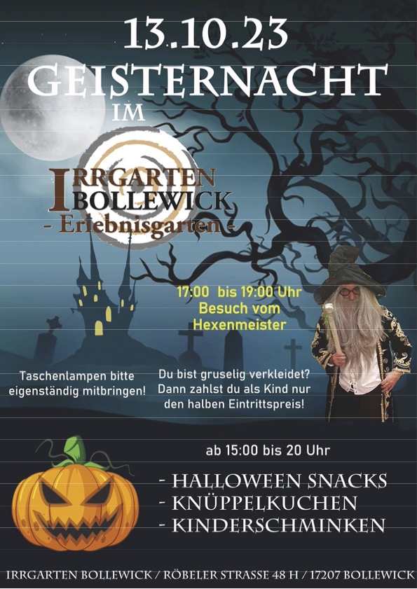 Wer es gerne gruselig mag, ist am kommenden Freitag – ja, es ist auch noch ein 13. – im Bollewicker Irrgarten genau richtig. Das Team des Erlebnisgartens lädt ab 15Uhr zur Geisternacht ein. Der Hexenmeister hat seinen Besuch angekündigt, und auch ansonsten dürfte es schaurig schön werden.