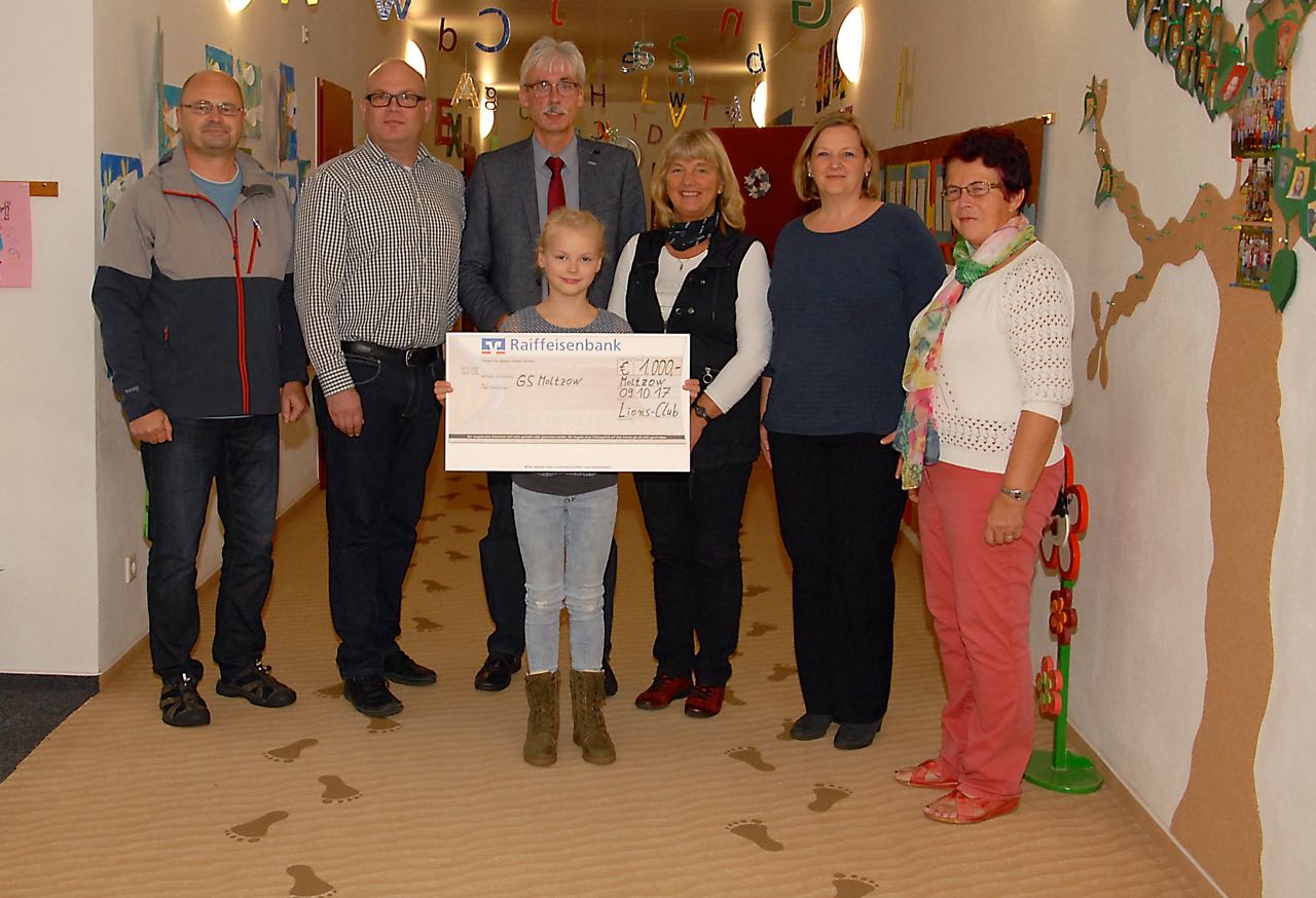 Bild: Jörg Peters, Ole Steindorf-Sabath, Helmut Kücker, Schülerin Cecil Fiege, Ute Schmidt, die Vorsitzende des Schulfördervereins Katrin Fiege und Rechnungsführerin Brigitte Klenke bei der Spendenübegabe.