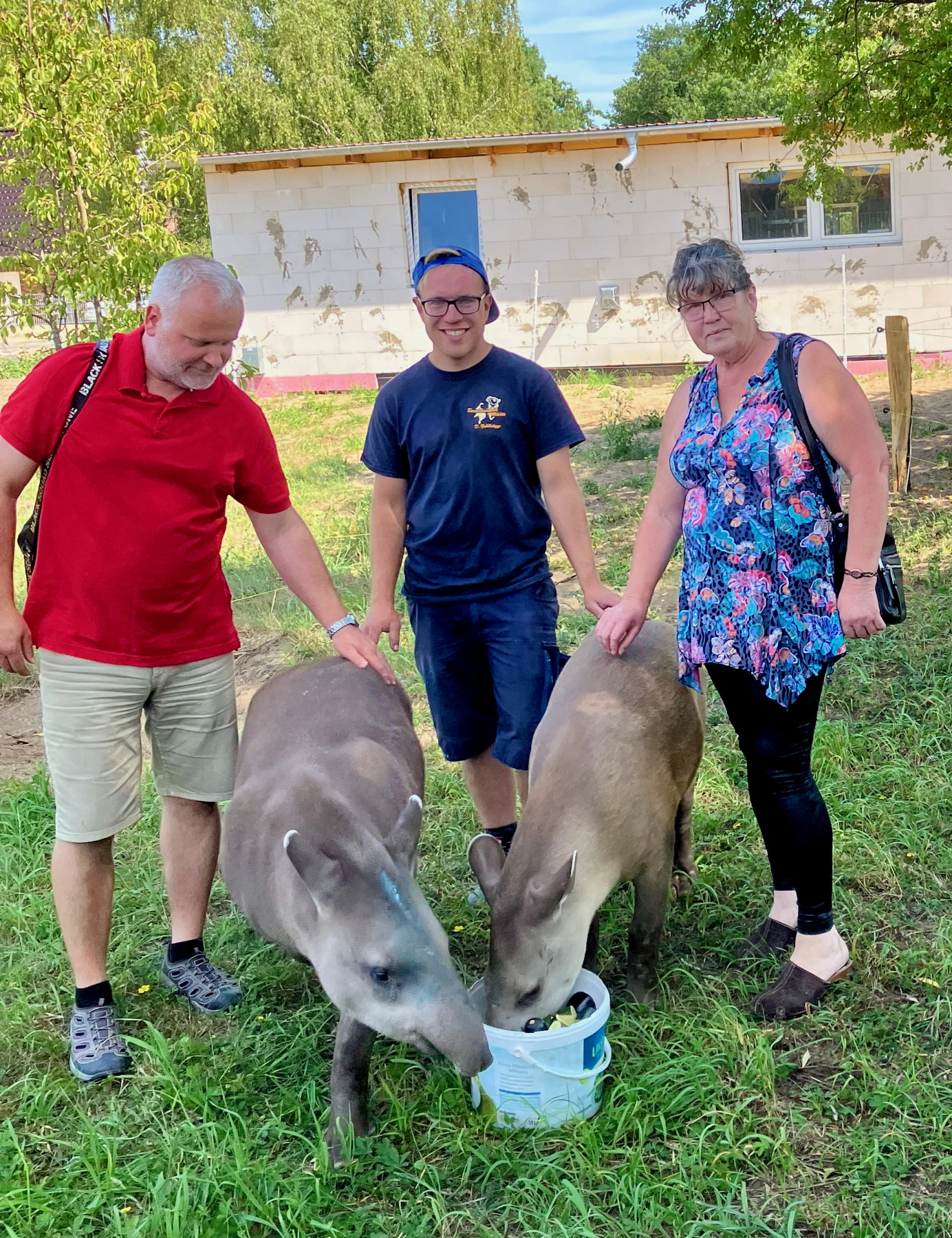 Der Tiererlebnispark in Grabowhöfe ist eines der beliebtesten Ausflugsziele in der Region. In den vergangenen Jahren sind immer mehr Tiere hinzu gekommen, teilweise auch aus schlechter Haltung gerettet. Doch die Tiere müssen natürlich auch ordentlich und artgerecht versorgt werden. Das ist nicht ganz billig, und so bietet der Park so genannte Tier-Patenschaften an. Die Tapire Miriam und Pablo haben jetzt einen ganz besonderen Paten: Die Gemeinde Grabowhöfe. Bürgermeister Enrico Malow und Gemeindevertreterin Karin Brockmann-Freese haben sich gemeinsam mit Tierpfleger David schon mal mit ihren neuen „Patenkindern“ vertraut gemacht.