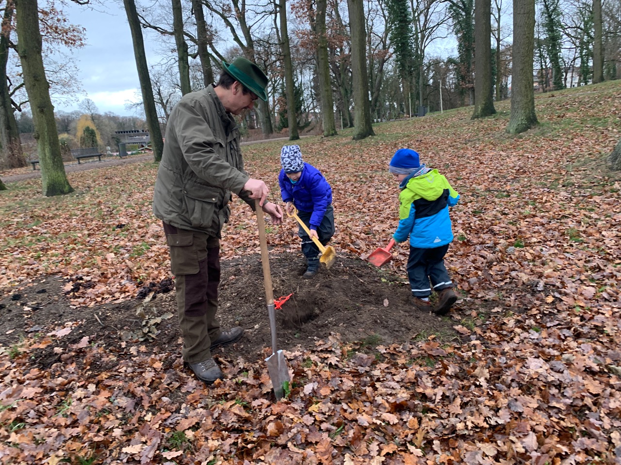 Bis die Mädchen und Jungen die ersten Kastanien von „ihren“ Bäumen essen können, werden mindestens drei bis fünf Jahre ins Land ziehen. Um die Zeit wenigstens ein bisschen zu überbrücken, gab’s von den Jägern für die Buddelei auf dem Mühlenberg nicht nur einen „Orden“, sondern sicherheitshalber auch ein paar Süssigkeiten dazu.