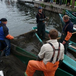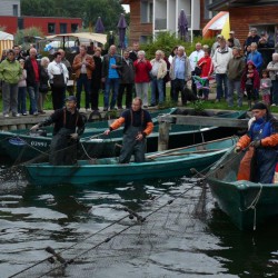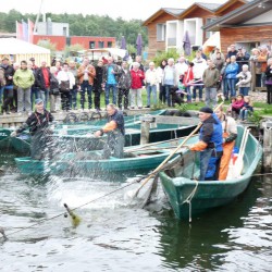 Zum Verschnaufen bleibt den Fischern nur wenig Zeit, denn schon am kommenden Wochenende geht’s zünftig weiter. Am Sonntag, 29. September, lockt mit dem großen Abfischen ein weiteres Spektakel auf den Fischer- und Angelhof Bolter Schleuse. Um 10.30 Uhr und um 14.30 Uhr Fisch3werden die Boeker Angelteiche abgefischt. Ein Ereignis aus dem Alltag der Fischer, das die Zuschauer in den vergangenen Jahren mit Begeisterung verfolgt haben. Aber auch zwischendurch kommt keine Langeweile auf. Neben dem Unterhaltungsprogramm für Jung und Alt dürften das Wasserspielmobil und das Schminken bei den Kleinen hoch im Kurs stehen. Außerdem können die Gäste dem Fischermeister beim Räuchern über die Schulter schauen und die Leckereien frisch aus dem Ofen kosten. Apropos lecker: Neben frischem Fisch bietet der Ziegenhof Retzow an diesem Tag viele interessante Häppchen aus seinem Sortiment.