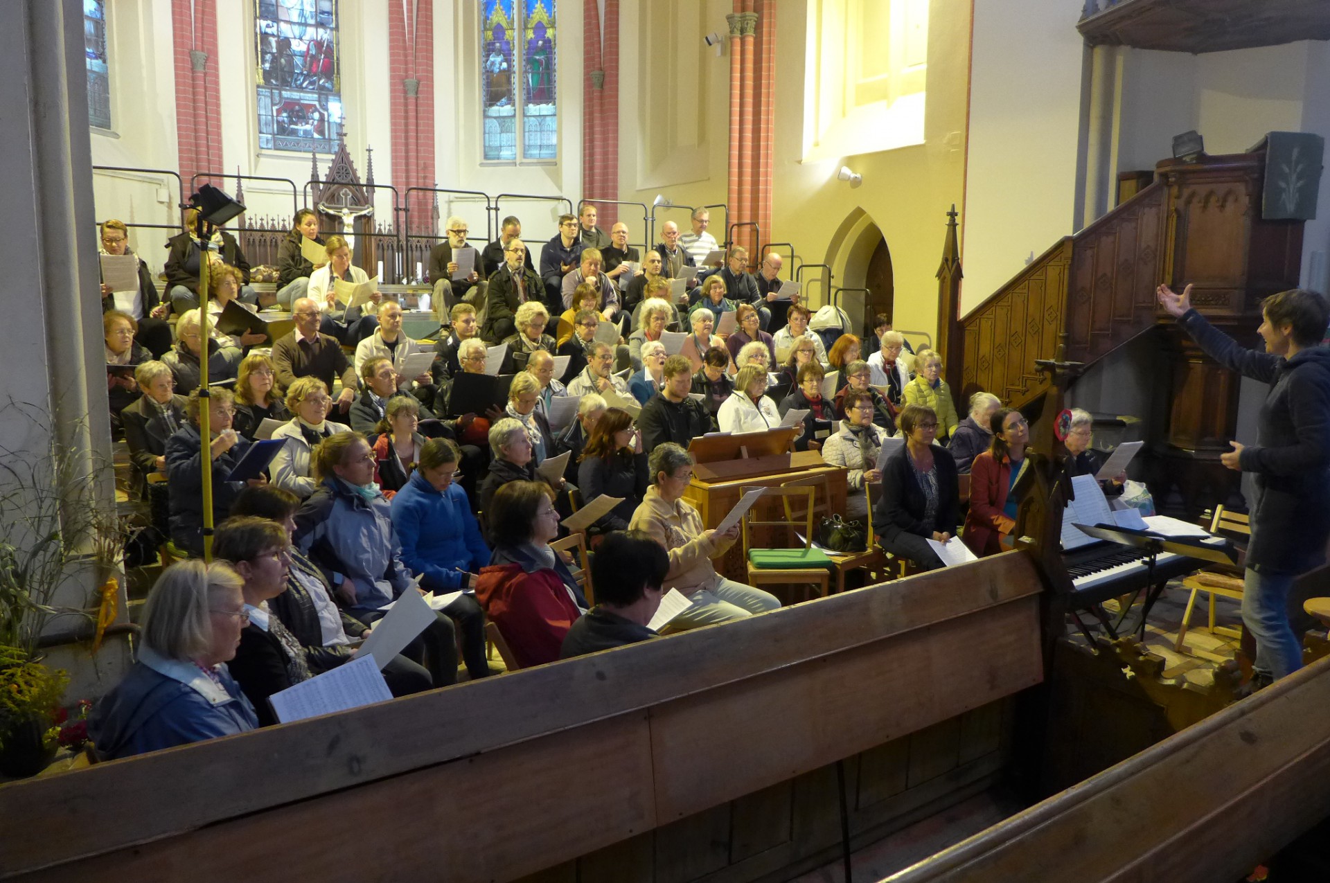 Die Mitglieder des Kantatenchores und des Kirchenchores haben schon geprobt – das macht es allen spontanen Mitsängerinnen und -sängern leichter, sich hineinzufinden.