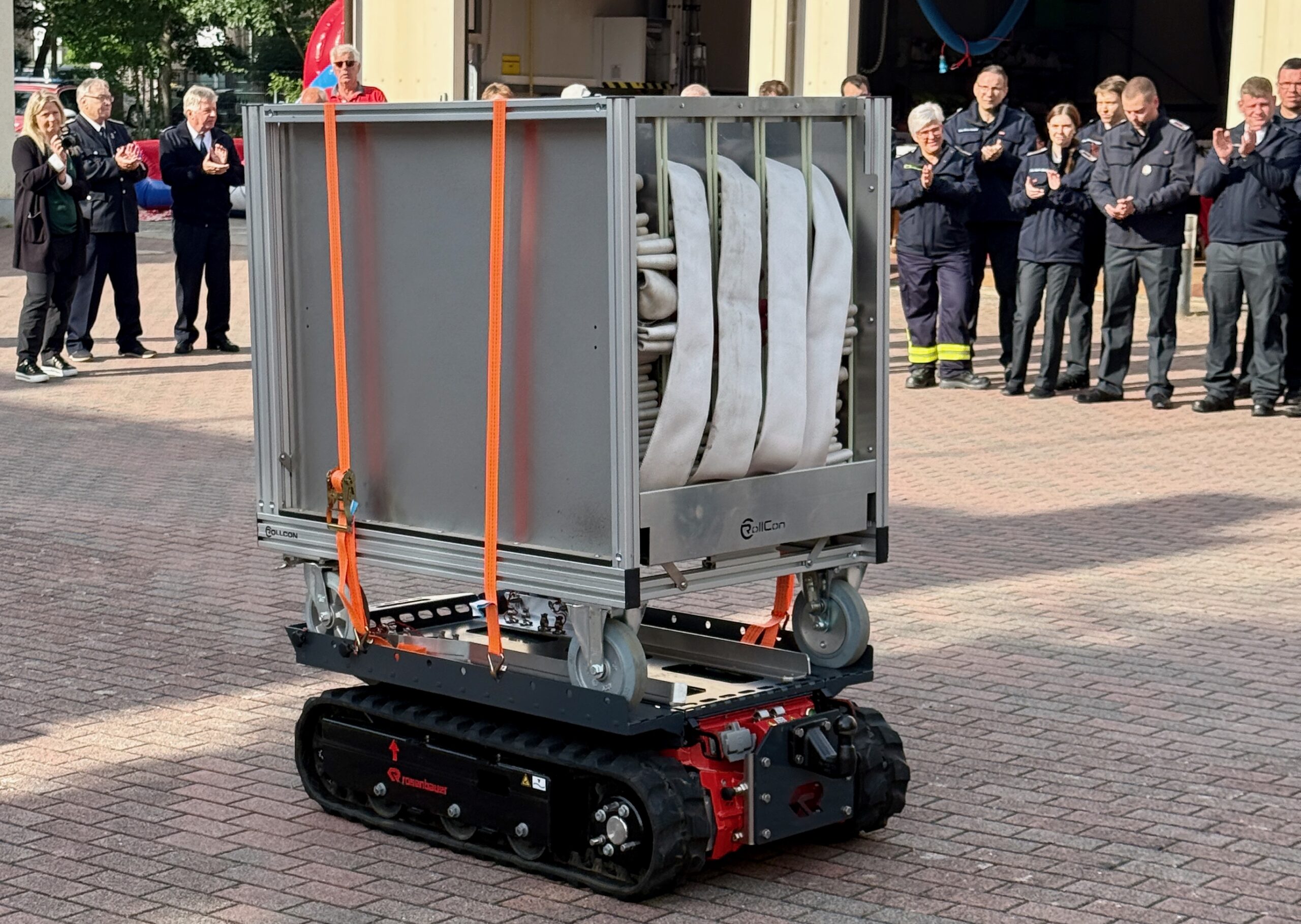 „Der Roboter ersetzt keine Feuerwehrleute, entlastet sie aber“, so Reimond Kamrath. So transportiert der neue „Kamerad“ Schläuche, fährt in Objekte, in denen es für die Retter zu gefährlich ist, hat eine Wärmebildkamera und kann auch löschen. Treppen sind für ihn kein Hindernis, unebene Böden schon gar nicht. Gesteuert wird er von eine Bedieneinheit, die so ein bisschen einem Controller der Playstation ähnelt. In den kommenden Wochen werden mehrere Ehrenamtliche daran ausgebildet. Wehrleiter Kamrath erinnerte bei der Vorstellung auch an den Großbrand der Bootswerft in Kamerun vor gut einem Jahr, als ein Kamerad durch herunter stürzende Teile in einer Halle schwer verletzt wurde. „Jetzt können wir den Roboter in solchen gefährlichen Situationen nutzen, um beispielsweise zu kontrollieren, ob es noch Glutnester gibt. Dass sich Feuerwehrleute in Gefahr begeben, ist nicht mehr nötig“, so Reimond Kamrath.