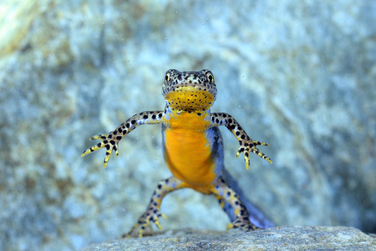 Ein bunter, eleganter Alpenmolch in voller Farbenpracht und ungewöhnlicher Pose hat es Vittorio Ricci aus Italien angetan. Er hat nach langem Warten im richtigen Moment den Auslöser gedrückt und so für ein wunderbares Plakatmotiv gesorgt.