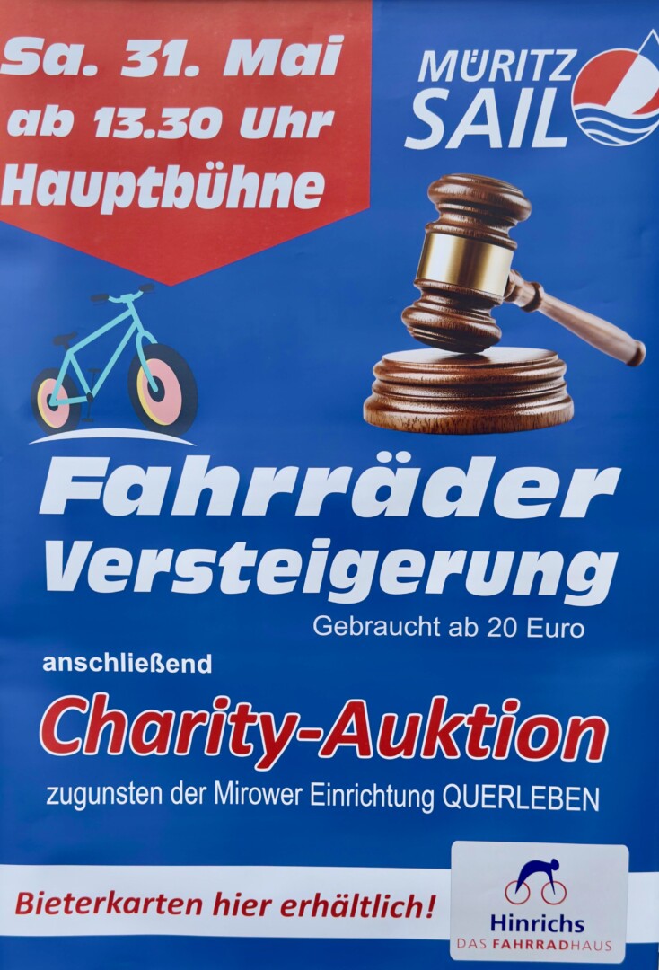 Bei der Müritz Sail, die heute Abend offiziell eröffnet wird, aber auch jetzt schon gut besucht ist, gibt es etwas Neues. So lässt das Fahrradhaus Hinrichs am Sonnabend, 31. Mai, ab 13.30 Uhr auf der Hauptbühne 20 gebrauchte Fahrräder versteigern. Mit dabei sind Modelle im Wert von 20 bis 2000 Euro. „Es handelt sich um Räder von Kunden, die alle gut in Schuss sind“, sagt Inhaber Thorsten Hinrichs und kündigt zugleich eine weitere Auktion an, die gleich im Anschluss läuft. Denn ab 14 Uhr geht es um den guten Zweck. Rund 50 tolle Dinge kommen bei der Charity-Auktion unter den Hammer, professionell angeboten von Kai Krügel. Versteigert werden unter anderem ein Holz-E-Bike im Wert von über 4000 Euro, das vom Fahrradhaus Hinrichs gestiftet wird. Außerdem ein Strandkorb, Hansa-Trikots, Urlaubs- und Geschenkgutscheine, Hausbooturlaub, Schmuck und Uhren sowie ein Ball von den Rostock Seawolves mit den Unterschriften der Spieler. Der Erlös kommt der Einrichtung „Querleben“ in Mirow zugute, die sich um schwerstkranke Kinder und ihre Angehörigen kümmert.