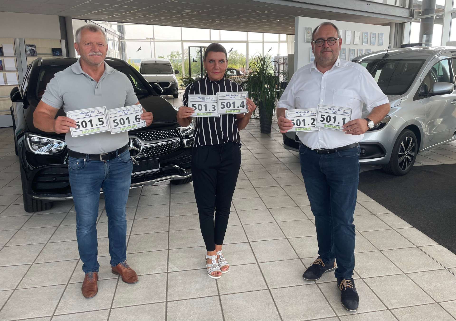 Foto oben: Kerstin Müsebeck von der Warener BARMER und Bernd Fahrenholz von Mercedes Brinkmann haben gestern die Startnummern für den Müritz-Lauf an Ingo Warnke übergeben.