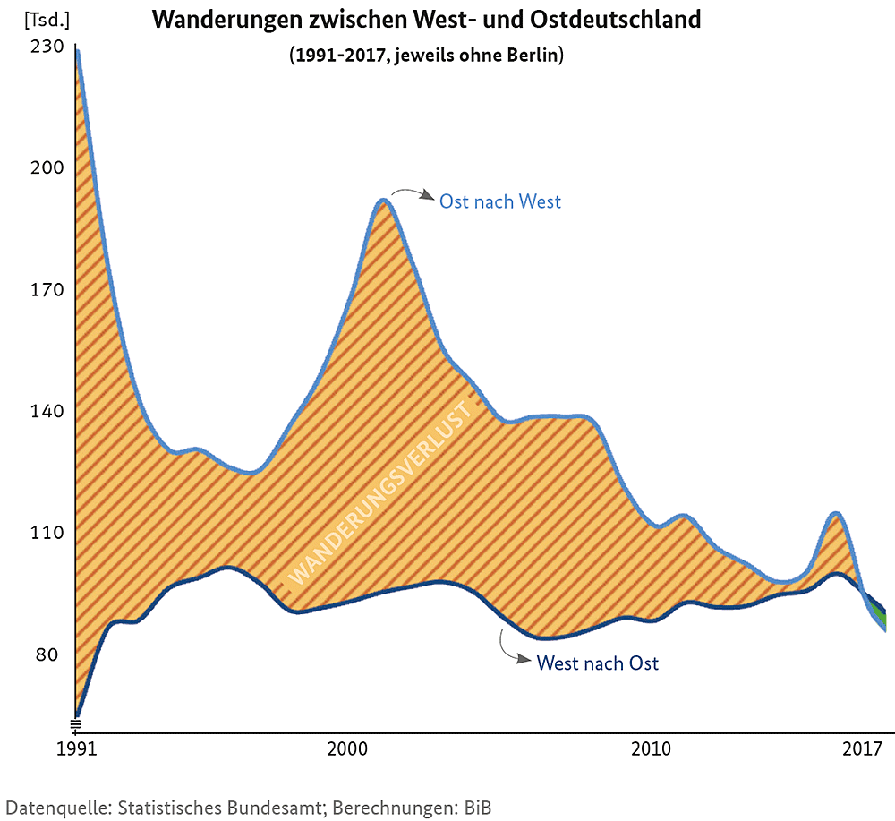 Damit ist die lange anhaltende Tendenz der Ost-West-Wanderung gestoppt – in den 26 Jahren davor hatten die ostdeutschen Flächenländer insgesamt mehr als 1,2 Mio. Bürger durch Wegzüge an den Westen verloren.