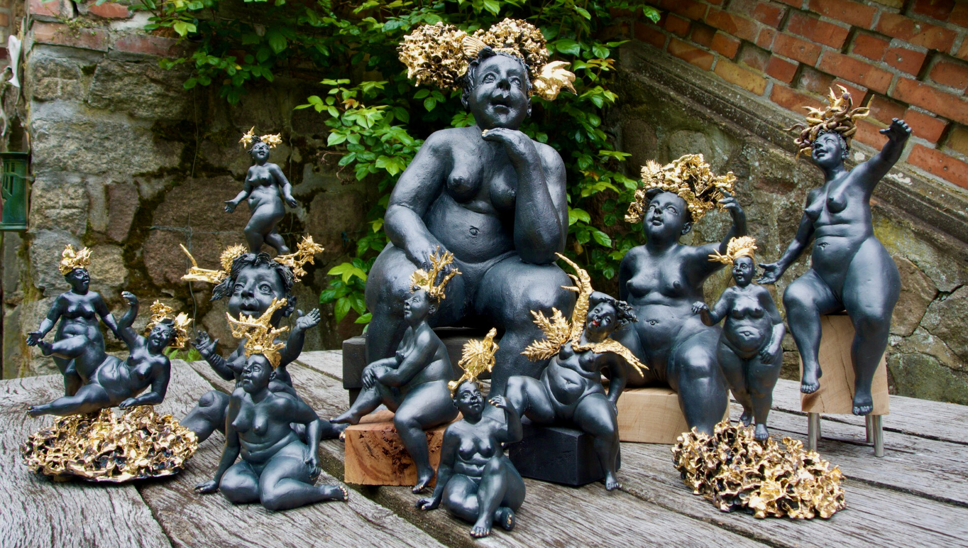 Haste Töne? Goldig herausgeputzt haben sich die Keramik-Ladies des Tonkünstlers Friedemann Henschel, um ihre Pilger zu KunstOffen am Pfingstwochenende in seiner idyllisch gelegenen Panschenhagener Gutshaus-Werkstatt zu empfangen. Ihr edler Flitter-Kopfschmuck ist aus besonderem Goldbrand hergestellt. Der Keramiker und zugleich passionierte Angler beköstigt seine Gäste zudem mit selbst geräuchertem Fisch. Also, ein Ausflug zu Pfingsten nach Panschenhagen zwischen Waren und Teterow lohnt allemal.