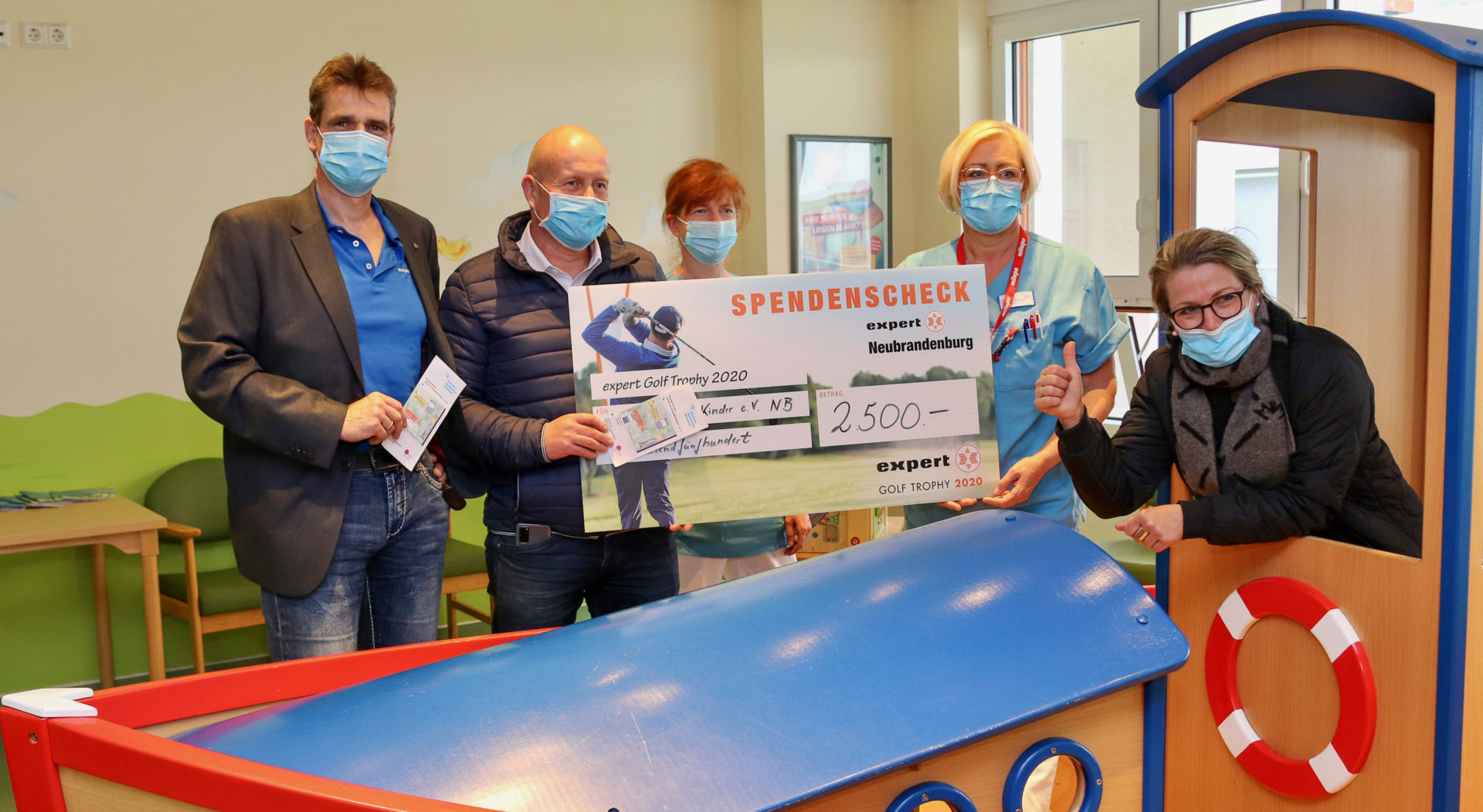 Die Freude war auf beiden Seiten groß – bei den Spendern, weil sie sich sicher sein können, dass ihr Geld in der Region bleibt, bei den Empfängern, weil sie wieder etwas mehr tun können für die kind- und familiengerechte Ausstattung im Dietrich-Bonhoeffer-Klinikum Neubrandenburg und für einen möglichst erträglichen Aufenthalt der kleinen Patienten. Die Krankenschwestern Jeannette Mundthal und Martina Diekow vom Förderverein „Kind im Krankenhaus“ e.V. nahmen von Udo Kuhn, Vorsitzender des Golfclubs Mecklenburg-Strelitz, und René Müller, Leiter des Elektronikfachmarkts Expert in Neubrandenburg, einen symbolischen Scheck über 2500 Euro entgegen. Die Spenden sind bei caritativen Golf-Turnieren des Vereins gesammelt worden, unter anderem bei der firmeninternen „expert Golf Trophy 2020“.