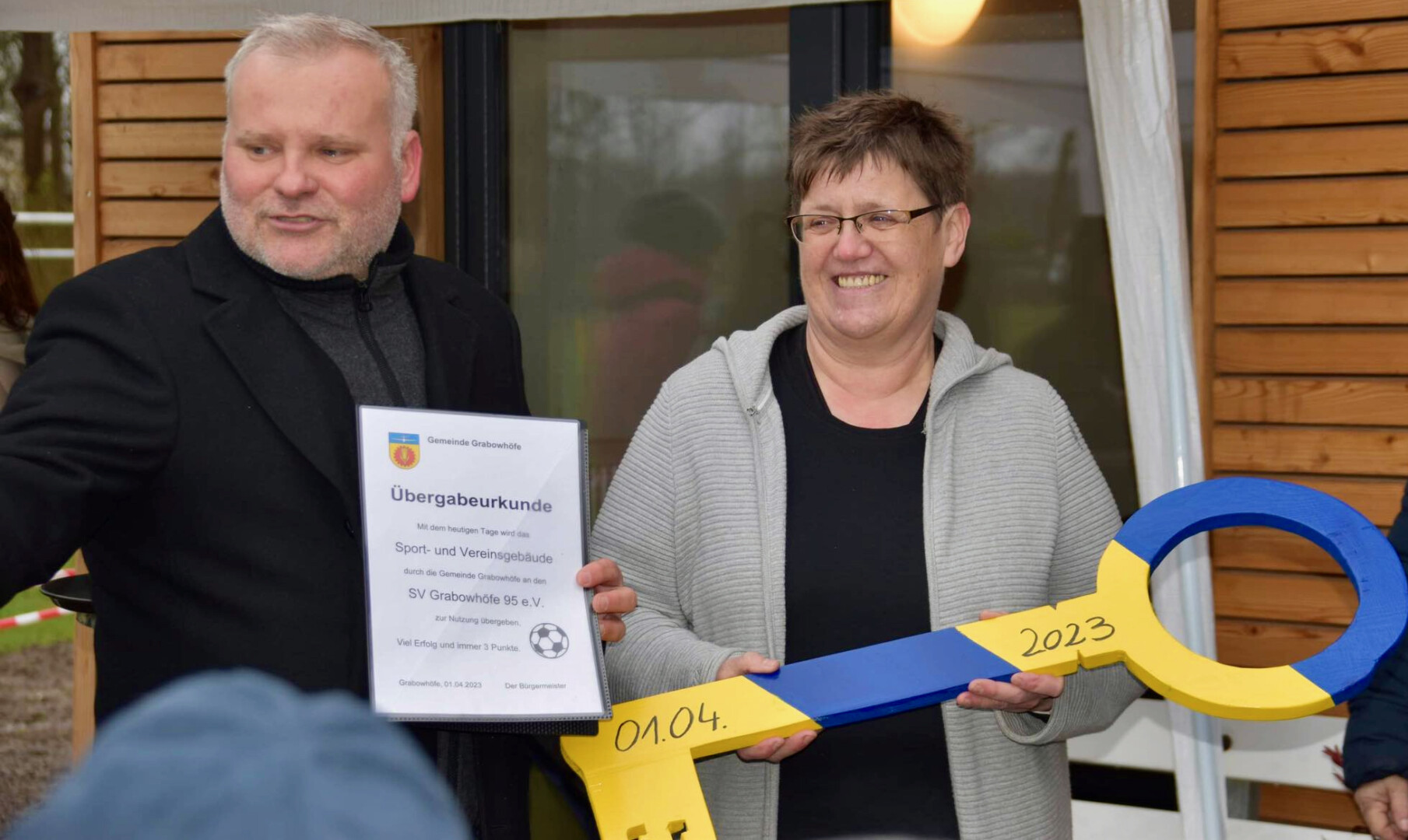 Das war wirklich ein hartes Stück Arbeit: Aber in Grabowhöfe haben sie es hinbekommen – durch Zusammenhalt und Hartnäckigkeit. Nach jahrelangem Kampf und viel Einsatz von Ehrenamtliches hat der SV Grabowhöfe jetzt ein neues Vereinsheim. Bürgermeister Enrico Malow konnte am Wochenende nach einem Jahr Bauzeit endlich den Schlüssel für das Gebäude an die Chefin des Vereins, Rekarda Disteler, übergeben. Doch die Bauzeit an sich war nicht das Problem, sondern die Vorbereitung. Letztendlich ist es der Gemeinde gelungen, alle möglichen Geldhähne anzuzapfen und das nötige Geld aufzubringen. Rund 450 000 Euro hat das neue Heim gekostet. Davon profitieren jetzt die rund 100 Mitglieder des Vereins – darunter viele Kinder.