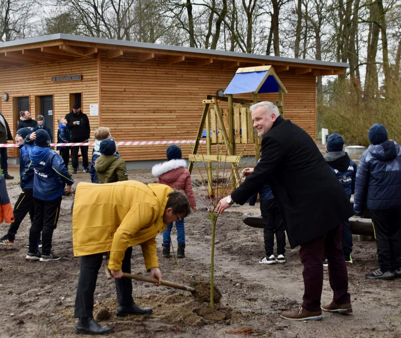 Nach der Schlüsselübergabe pflanzte sie mit dem Bürgermeister eine Weide, die Hoffnung symbolisieren soll.