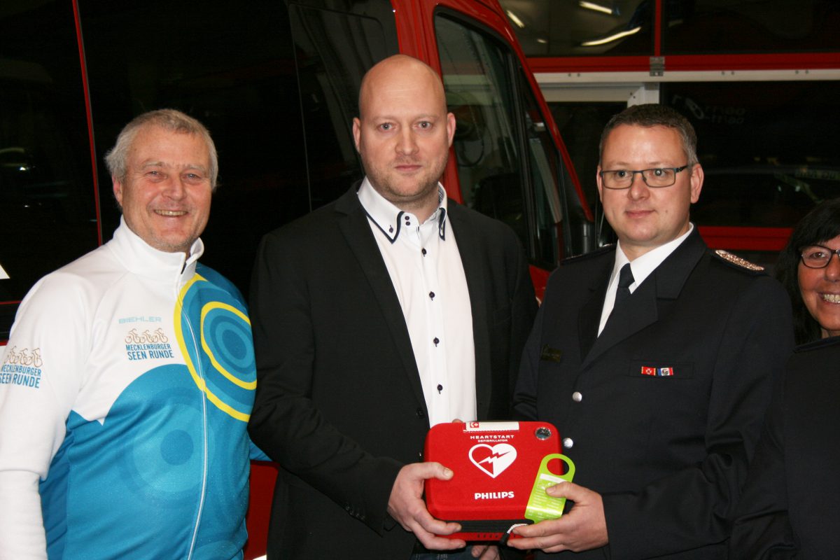 Der Sicherheitsgedanke wird dabei auf beiden Seiten buchstäblich groß geschrieben. Damit lebensrettende Sofortmaßnahmen im Ernstfall noch schneller als bisher greifen können, haben die Mecklenburger Seen Runde und einer der stärksten Partner des Events, die Itzehoer Versicherungs AG, in Carpin einen Defibrillator, besser bekannt unter dem Namen „Defi“, an die Freiwilligen Feuerwehren des Amtes Neustrelitz Land übergeben.