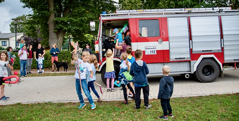 Die Groß Vielener Bauern liefen am vergangenen Sonntag am Nachmittag aufgeregt durch das Dorf und suchten Hilfe. Ihre Pferde waren entlaufen. Gut, dass die Feuerwehr und die Kinder auf dem neuen Spielplatz zugegen waren, denn dieser wurde nach erfolgreicher TÜV-Prüfung gerade eingeweiht. Zu diesem Anlass erschienen Jung und Alt zahlreich, und so bekamen die Bauern tatkräftige Unterstützung – nicht nur von der Feuerwehr, sondern auch von den Kindern.