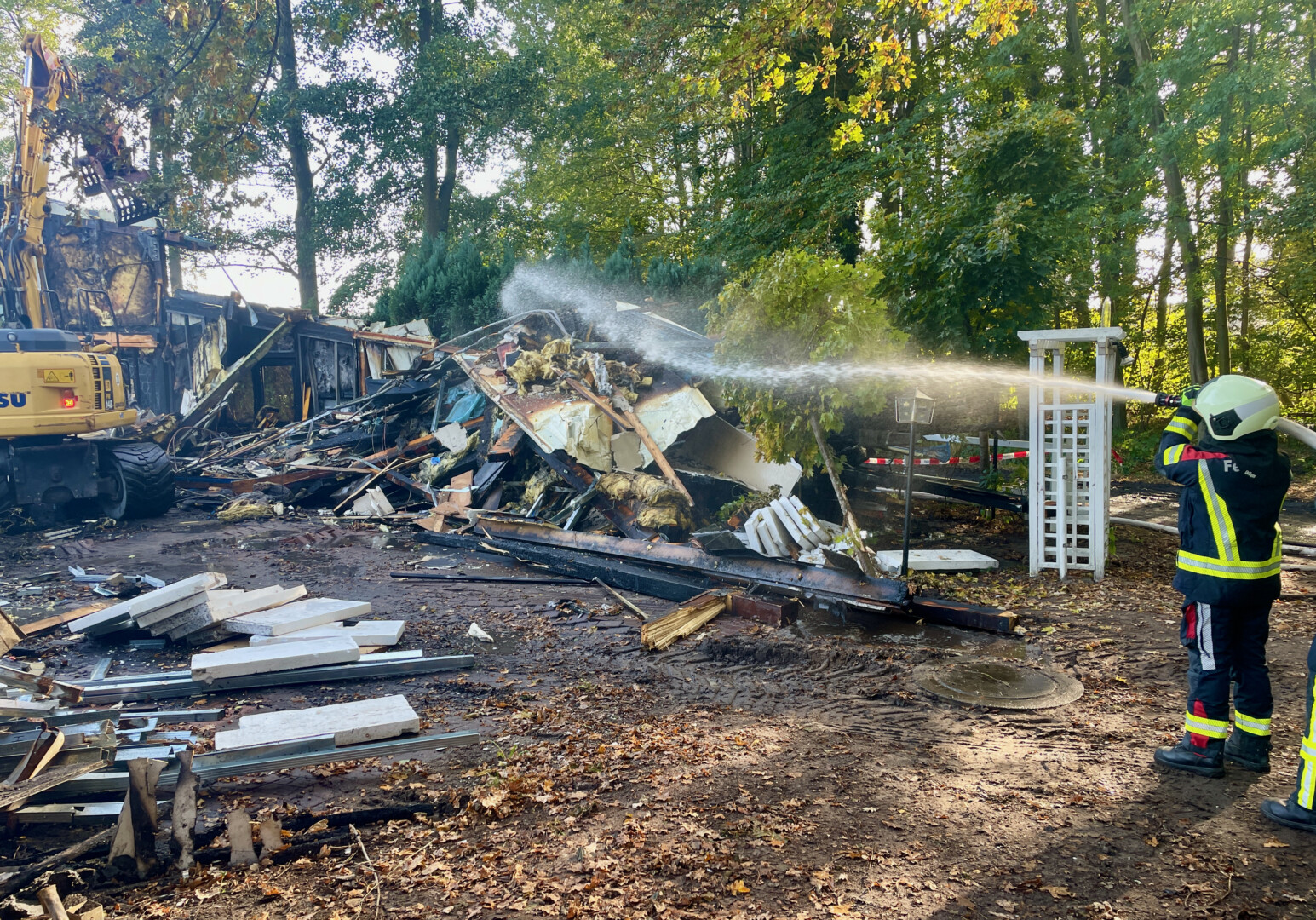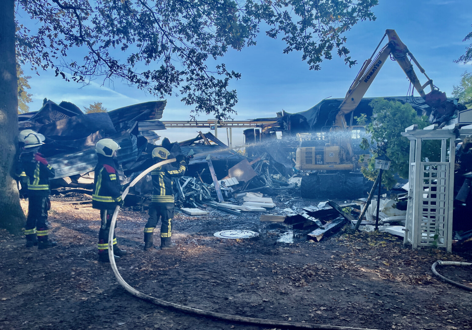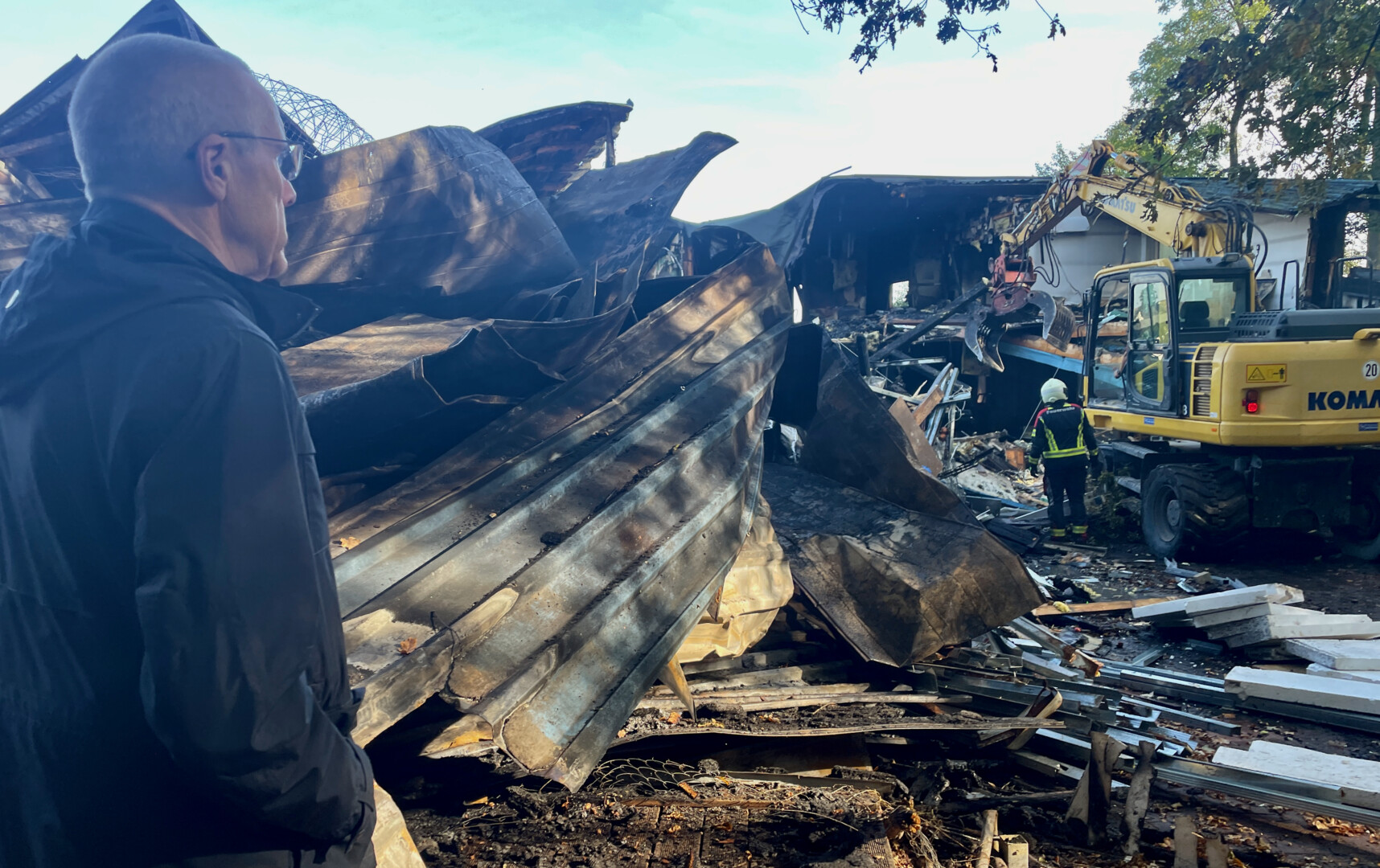 Er hat alles verloren – seine Wohnung, seine Firma, persönliche Erinnerungsstücke. Bis auf die Kleidung, die er am Donnerstag trug, ist Bootsbauer Jens Christen nichts geblieben. Reden über den verheerenden Brand, der sein Lebenswerk vernichtete, kann er noch nicht. Aber seine Mitarbeiter versuchen, Worte zu finden, auch wenn es ihnen sichtlich schwer fällt. Sie stehen zu ihrem Chef, zur Traditionswerft Christen. Sie wollen, dass es am Standort im Kameruner Wald weiter geht. Auch der 54-jährige Inhaber hat gegenüber Bürgermeister Norbert Möller geäußert, dass er noch einmal von vorne anfangen möchte. Vielleicht geben ihm die riesige Anteilnahme und Hilfsangebote, die er und seine Mitarbeiter derzeit erfahren, den nötigen Mut. Den wird der Unternehmer brauchen. Denn von der Werft und seinem Wohnhaus ist so gut wie nichts übrig geblieben. Da die Feuerwehr auch heute immer wieder ausrücken musste, weil versteckte Glutnester entflammt sind, konnte mit Genehmigung der Kripo mit den ersten Abrissarbeiten begonnen werden.