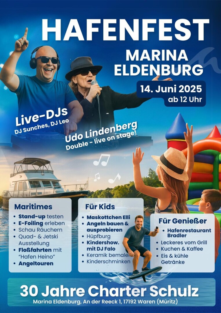 Große Party am Sonnabend in der Marina Eldenburg: Bei vorausgesagtem herrlichen Sommerwetter wird in der Marina vor den Toren Warens einiges geboten. Mit dabei neben Charter Schulz auch die Müritzfischer und das Hafenrestaurant. Apropos Yachtcharter Schulz. Das Unternehmen feiert in diesem Jahr den 30. Geburtstag und blickt auf eine Zeit voller Wachstum und Leidenschaft für den Wassersport zurück. Seit der Gründung im Jahr 1995 hat sich das Unternehmen nach eigenen Angaben zu einem führenden Anbieter für Yacht- und Hausbootcharter in Deutschland entwickelt.
