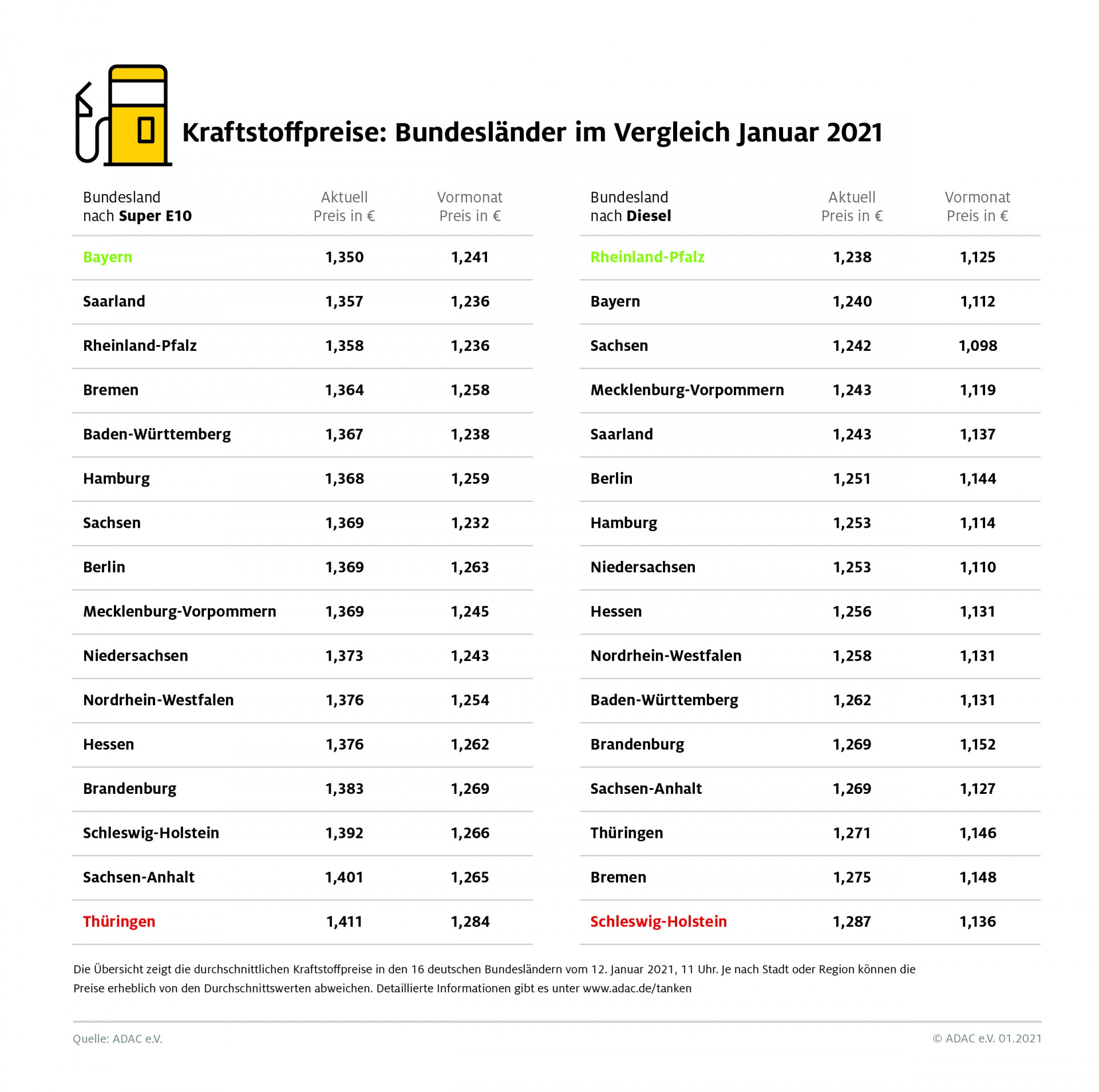 In der aktuellen Untersuchung hat der ADAC am Dienstag um 11 Uhr die Preisdaten von mehr als 14.000 bei der Markttransparenzstelle erfassten Tankstellen ausgewertet und den Bundesländern zugeordnet. Die ermittelten Preise stellen eine Momentaufnahme dar. Ausführliche Informationen rund um den Kraftstoffmarkt gibt es zudem unter www.adac.de/tanken