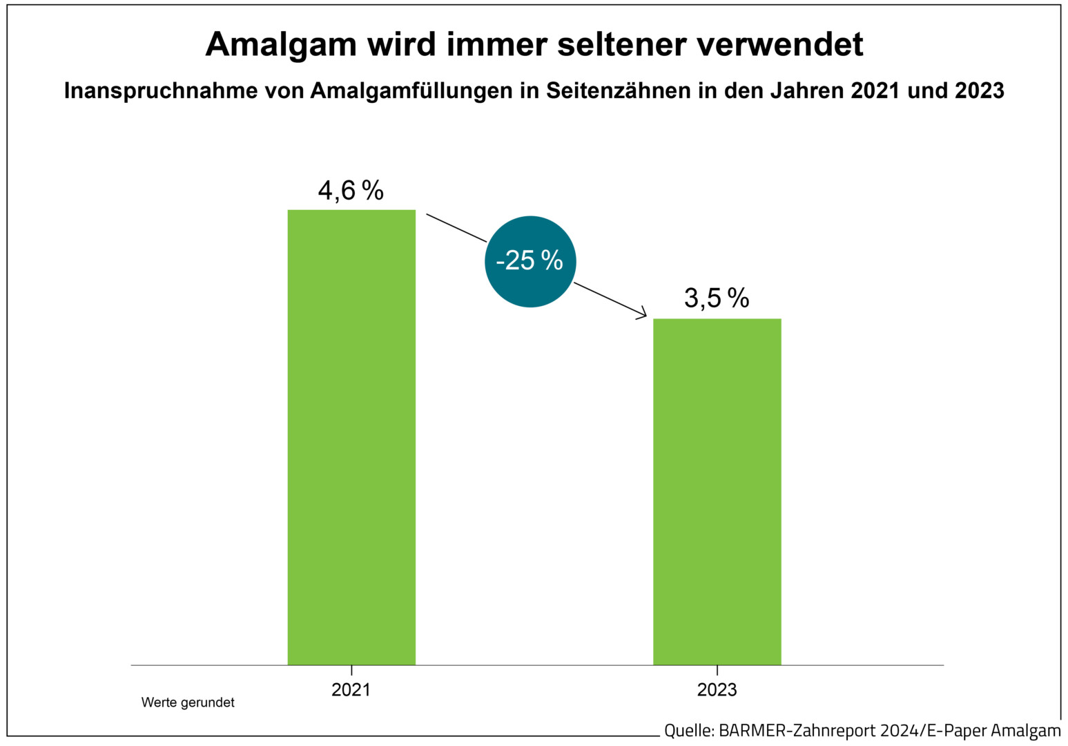 Dem Zahnreport zufolge bekamen im Jahr 2023 bundesweit noch 3,5 Prozent der Patienten in ihren Seitenzähnen eine Amalgamfüllung. Im Jahr 2021 lag dieser Wert noch bei 4,6 Prozent. In dem genannten Zeitraum ergibt sich also eine relative Abnahme von etwa 25 Prozent. Untersucht wurden für diese Werte rund 1,7 Millionen Patienten mit einer Seitenzahnfüllung.