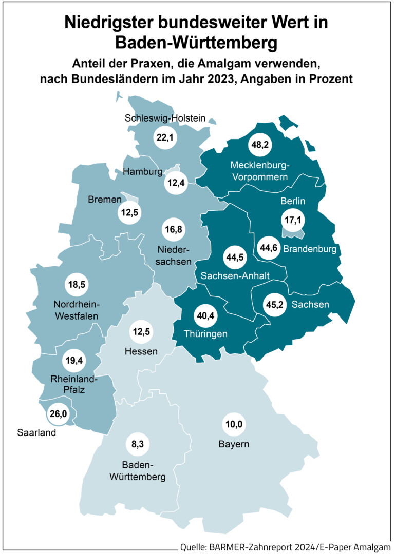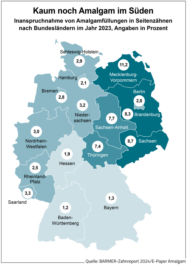 Jede neunte Person in Mecklenburg-Vorpommern erhält bei schadhaften Seitenzähnen eine Amalgamfüllung, in Baden-Württemberg hingegen nur jede 83. Das geht aus einer aktuellen Auswertung des Barmer-Zahnreports hervor, die vor dem Hintergrund des Amalgamverbots der Europäischen Union ab Januar 2025 erarbeitet wurde. Demnach gibt es nach wie vor große regionale Unterschiede beim Einsatz von Amalgam. Die niedrigsten Amalgamanteile bei der Inanspruchnahme von Seitenzahnfüllungen gab es im Jahr 2023 in Baden-Württemberg, Bayern und Hessen mit rund 1,2 beziehungsweise 1,3 und 1,9 Prozent. Spitzenreiter sind Brandenburg, Sachsen und Mecklenburg-Vorpommern mit 8,3 beziehungsweise 8,7 und 11,2 Prozent. „Im Interesse der Versicherten sind vor allem qualitativ hochwertige, zuzahlungsfreie Alternativen für Amalgam als Füllungswerkstoff wichtig. Eine Grundlage dafür ist die von Kassenzahnärztlicher Bundesvereinigung und GKV-Spitzenverband kürzlich erarbeitete Regelung“, sagt der Vorstandsvorsitzende der Barmer, Prof. Dr. med. Christoph Straub. Jedoch müsse der neue gesetzliche Anspruch auf eine zuzahlungsfreie Versorgung ohne Amalgam in den Praxen klar und unmissverständlich kommuniziert werden.