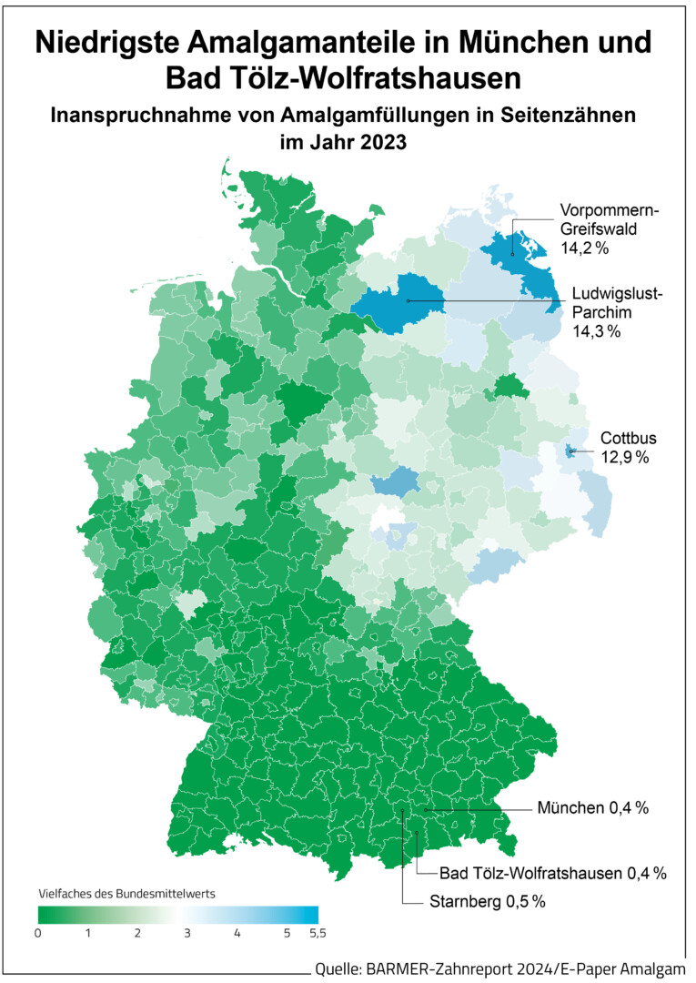 Nach den Daten der Barmer lag der bundesweite Anteil der Praxen, die mindestens eine Amalgamfüllung abrechneten, bei knapp 20 Prozent. Damit können bundesweit mehr als 80 Prozent der Praxen als „amalgamfrei“ bezeichnet werden. Eine alternative Versorgung der Patienten wird demnach offensichtlich schon vor dem Amalgamverbot ab 1. Januar 2025 von einer Vielzahl der Praxen umgesetzt.