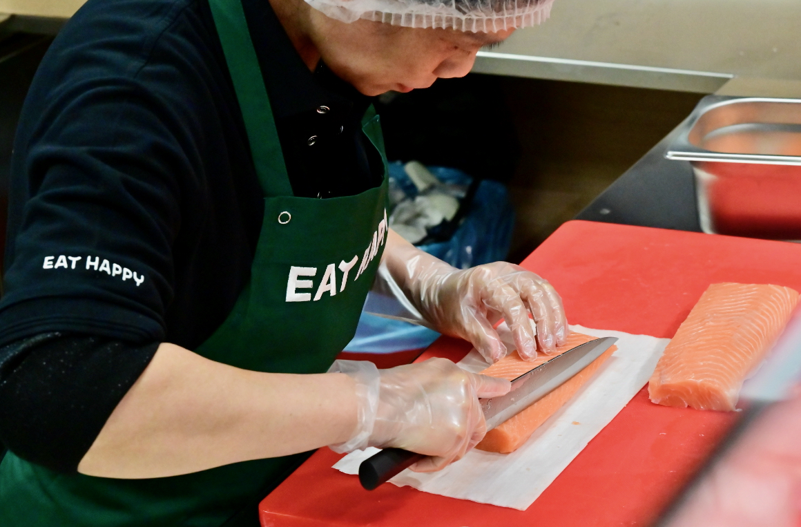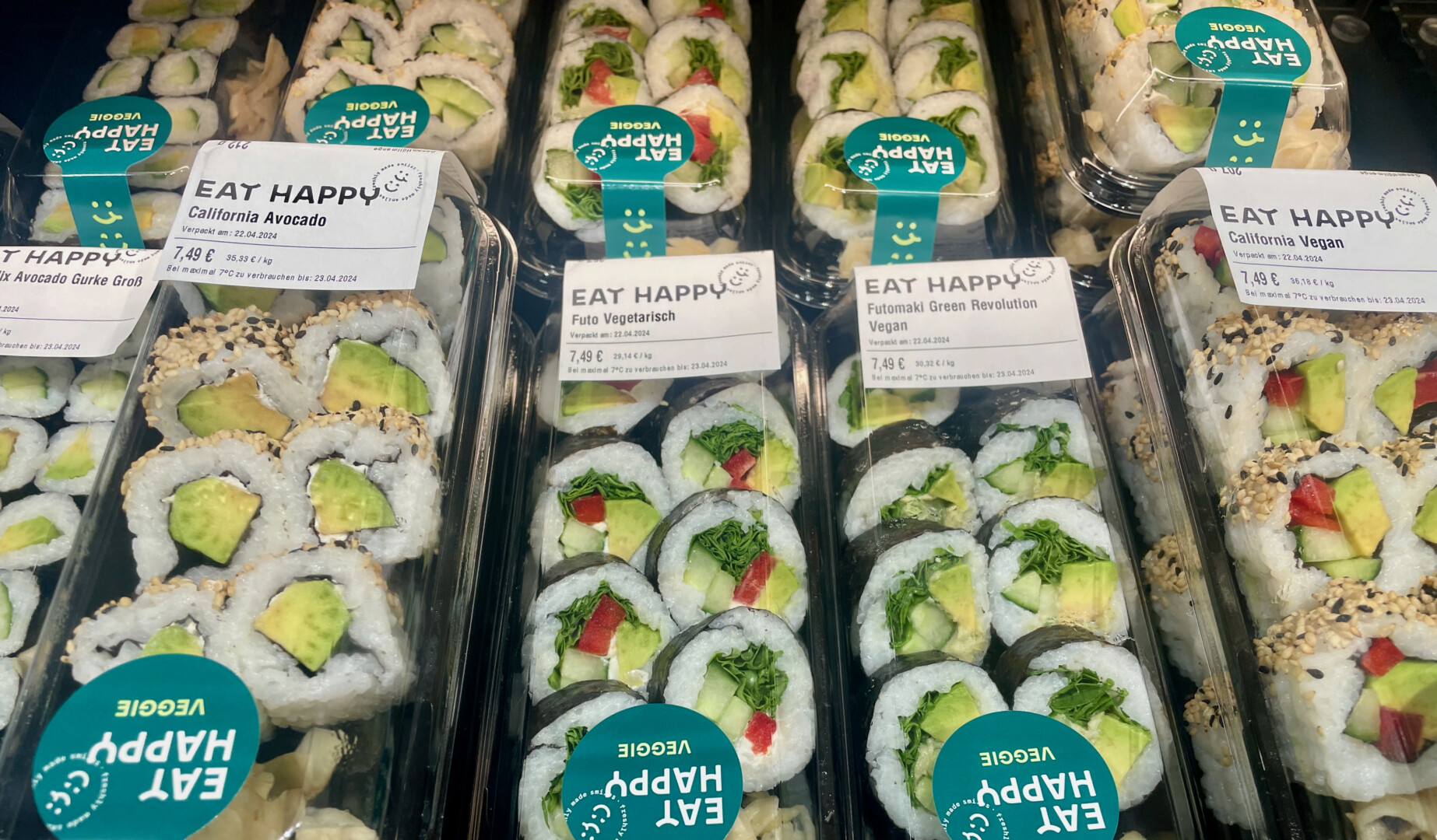 Gefertigt werden die Röllchen von asiatischen Mitarbeitern von „Eat happy“ direkt im Markt in der Teterower Straße, und zwar immer frisch. Wer möchte, kann ihnen bei der filigranen Handarbeit zuschauen. Beispielsweise, wenn man sein Sushi direkt bestellt und keine der vorab gefertigten Packungen nimmt. Denn man kann auch seine eigenen Behälter mitbringen, die Bestellung aufgeben und erhält dann die gewünschten Sushi. Die variieren auch regelmäßig, jeden Monat gibt’s neue Kreationen.
