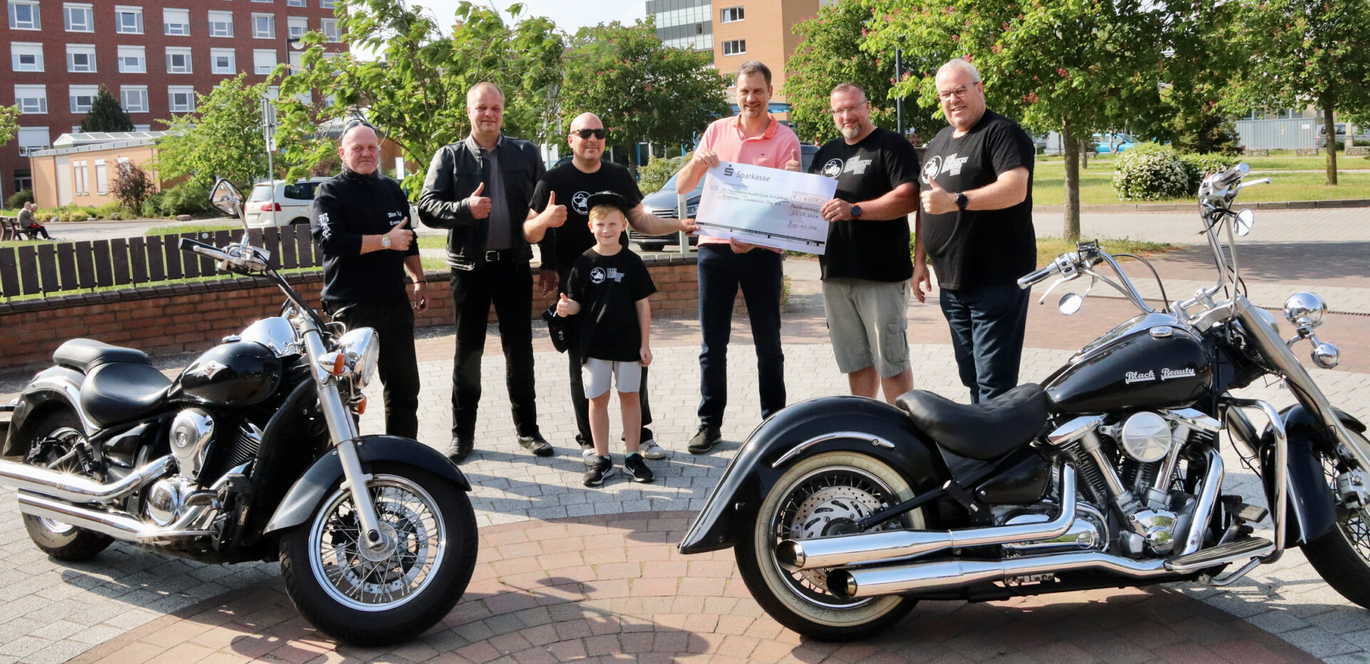 Foto oben: Dr. med. Sascha Alexander Pietruschka (3.v.r.) nahm den symbolischen Scheck vom Vorsitzenden des Vereins „Biker mit Herz e.V.“, Gordon Ullrich (2.v.r.), entgegen.
