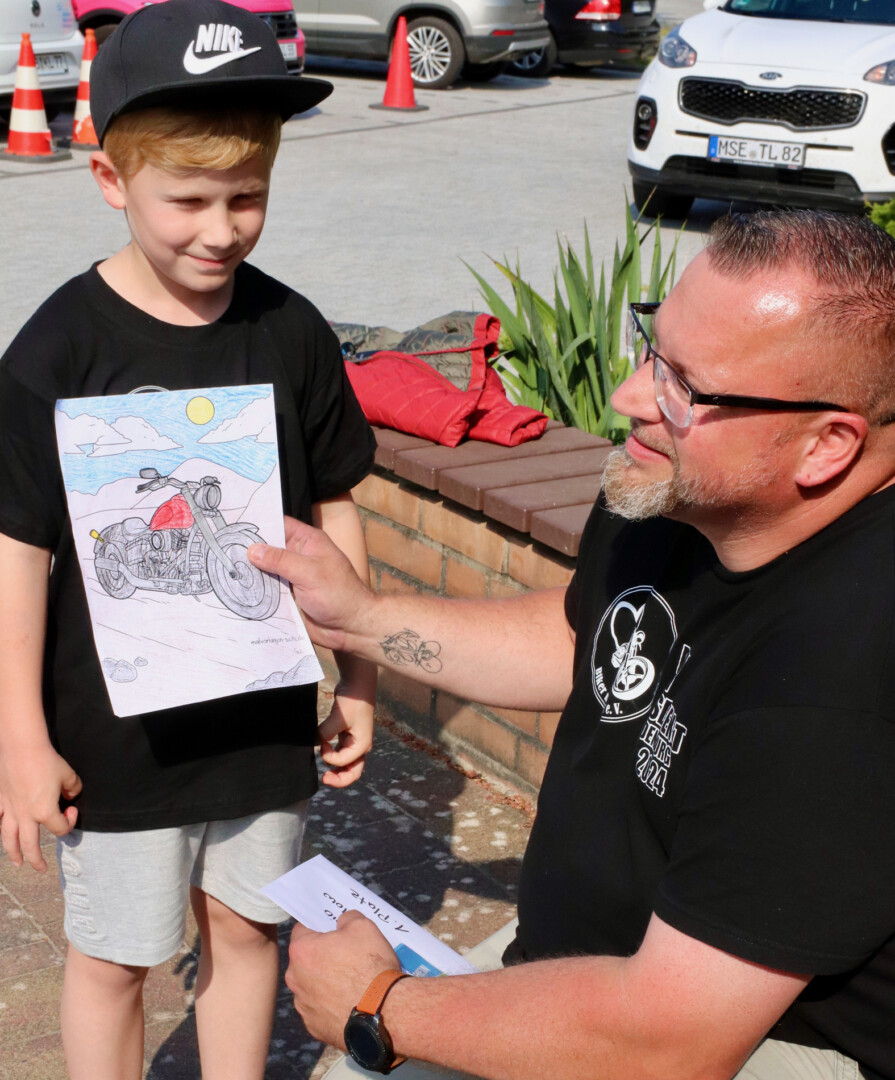 Die „Biker mit Herz“ nutzten die Spendenübergabe, um auch den Sieger des Malwettbewerbs beim Bikergottesdienst zu küren. In den sozialen Medien hatte das Bild des siebenjährigen Fabio Kuhlow die meiste Zustimmung bekommen. Dafür gab’s von den Motorradfreunden eine Familienkarte für die Müritz Therme in Röbel.