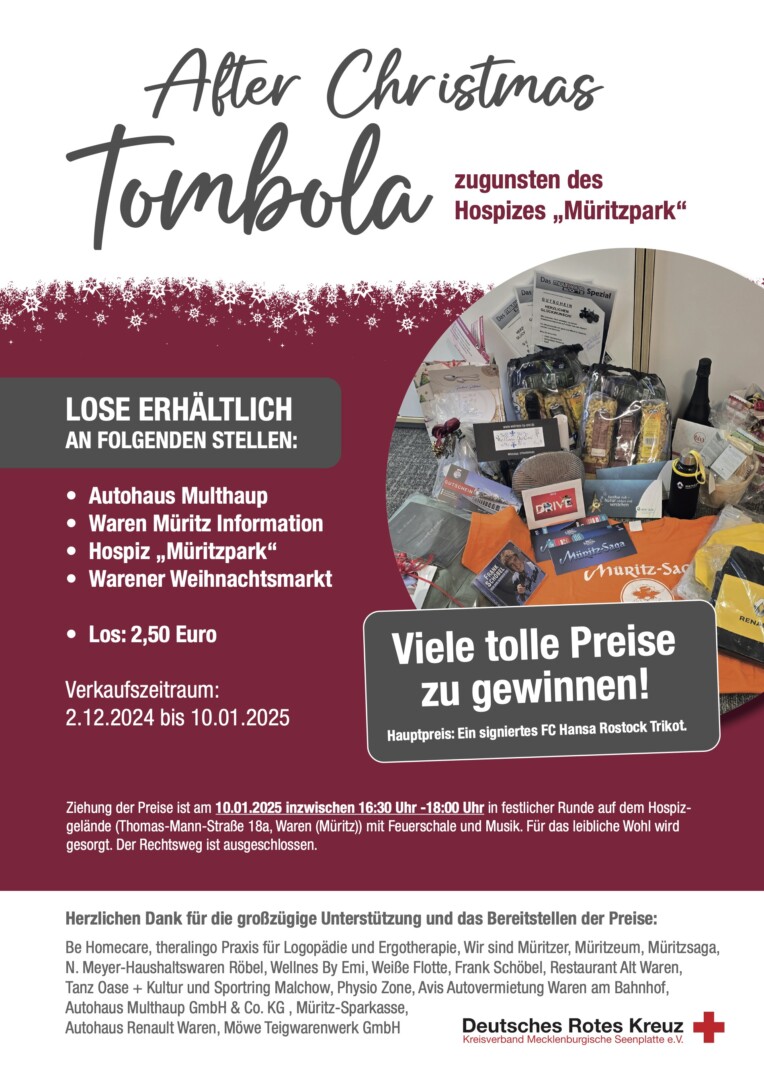 Wie bereits berichtet, musste der „Novemberzauber“ des Warener Hospizes krankheitsbedingt abgesagt werden. Doch das Team um Claudia Bajorat hat den Kopf nicht in den Sand gesteckt und sich etwas einfallen lassen. Dank vieler Spenden von Firmen aus der Region konnte nämlich eine große Tombola mit vielen schönen Preisen organisiert werden. Die sollte eigentlich während der Veranstaltung stattfinden, und läuft jetzt als „After-Christmas-Tombola“. Der Verkauf der Lose startet am morgigen Montag in verschiedenen Verkaufsstellen. Die Käufer der Lose haben nicht nur die Chance auf die Gewinne, sondern unterstützen zugleich die Arbeit des Hospizes „Müritzpark“.
