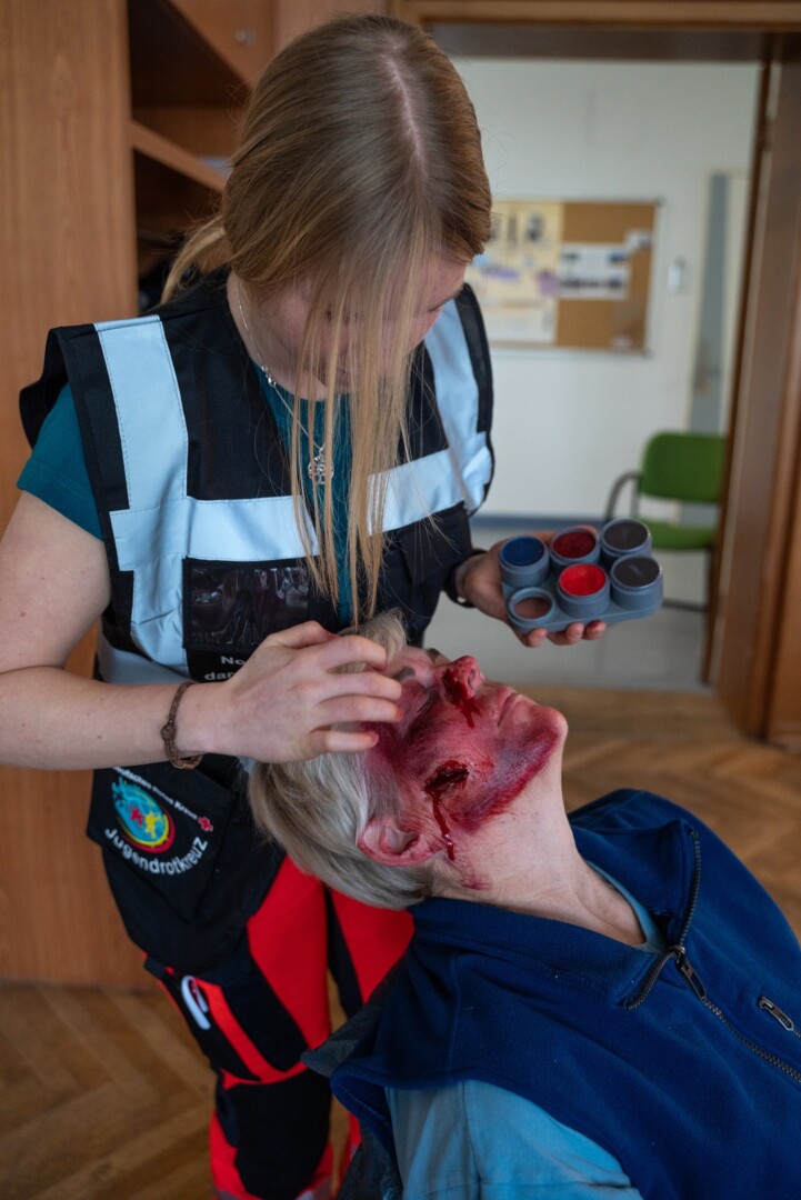 Insgesamt 40 „Verletzte“ gilt es zu versorgen – zwölf von ihnen sind lebensbedrohlich verletzt (Sichtungskategorie I), 15 schwer (SK II) und 13 leicht (SK III). Die Patienten sind allerdings keine echten Opfer, sondern Freiwillige der Medical Task Force Mecklenburg-Vorpommern des DRK. Professionell geschminkt und instruiert, machen sie das Szenario erschreckend realistisch.