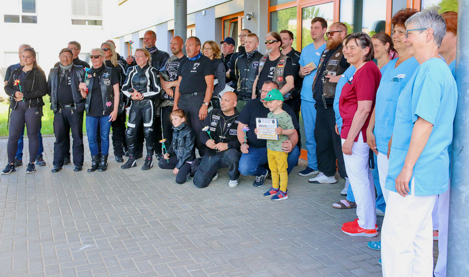 1590 Euro – diese krumme Summe konnte Patrick Gieb so nicht stehen lassen und steckte vor dem Kinderhaus des Dietrich-Bonhoeffer-Klinikums kurzerhand noch zehn Euro ins Spendenkästchen. Die Biker Friends MV um das Organisationstrio Klaus Gryzbeck, Remo Peters und Gordon Ullrich übergaben jetzt den Erlös aus der Spendensammlung im Rahmen des ersten Neubrandenburger Biker-Gottesdienstes am 8. Mai auf dem Marktplatz an Vertreter des Zentrums für Kinder- und Jugendmedizin. Einige Unternehmer haben zu den 1600 Euro ebenfalls etwas beigetragen. Dr. med. Annekathrin Tiedtke, Chefärztin der Klinik für Kinderchirurgie und –urologie, bedankte sich stellvertretend für das große Engagement der Motorradfahrer, die sich auch immer wieder für den Erhalt des Perinatalzentrums Level 1 zur Behandlung der kleinsten Frühchen am Klinikum einsetzen.