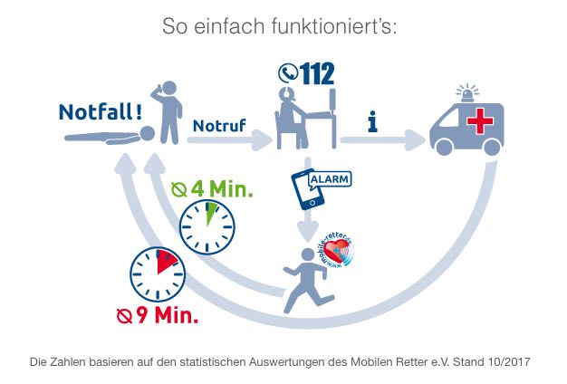 die fachlich fundierte Erste-Hilfe leisten können, in der Nähe des Hilfebedürftigen, ohne dass jemand davon weiß. Hier kommt das System einer Mobile-Retter-App ins Spiel.