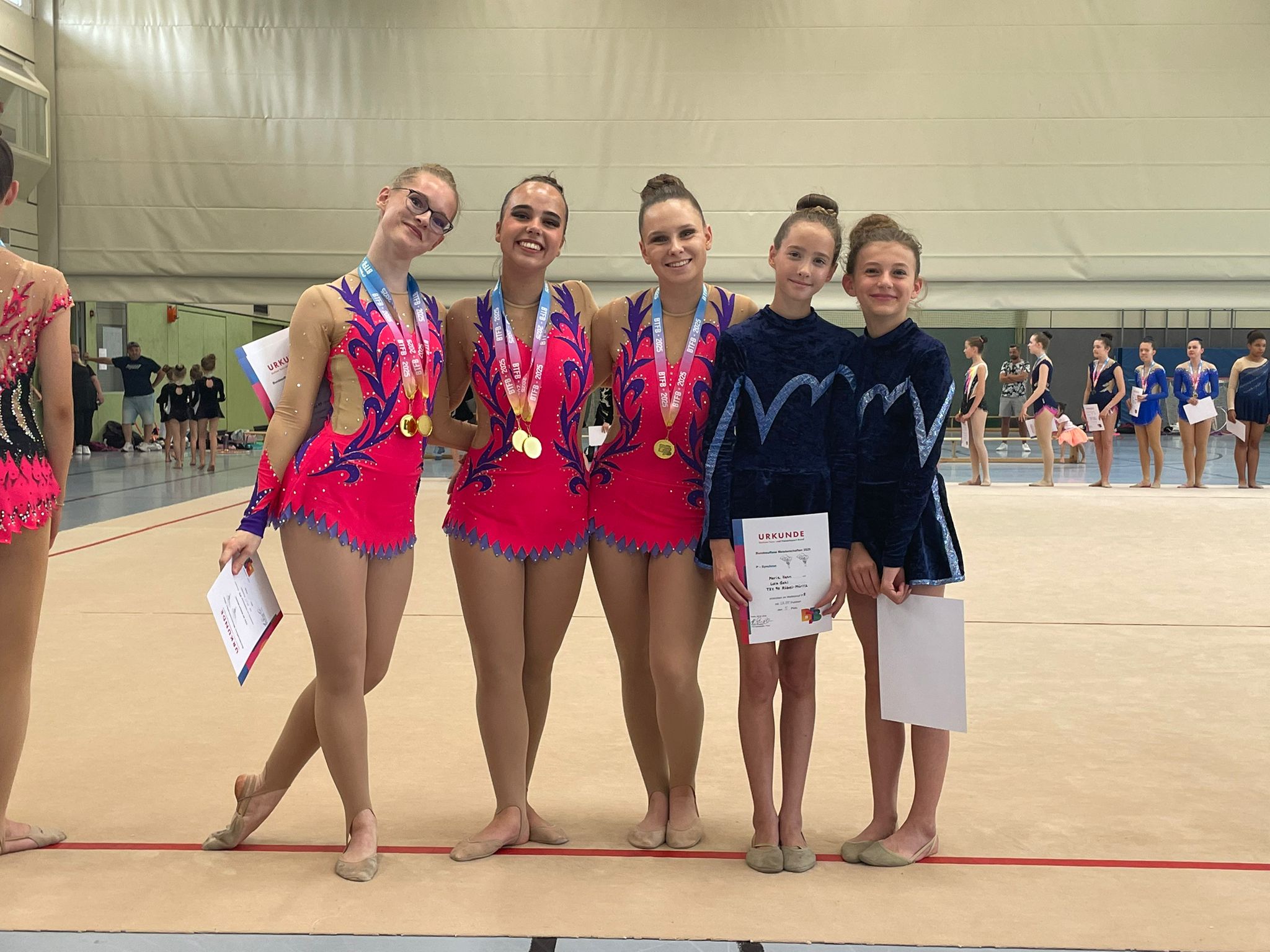 Am Wochenende fanden in Berlin die „Offenen Berliner Meisterschaften in der Wettkampfgymnastik“ statt. Mit strahlenden Augen, guter Laune und tollen Ergebnissen reisten fünf Teilnehmerinnen des TSV 90 Röbel/Müritz aus Berlin zurück. In der Pflichtstufe P-7 Synchronbereichen erreichten Daria Hartwig und Finja Stock den 1. Platz. Sie lieferten ihre Übungen mit Seil, Keulen und Reifen am souveränsten ab. Ebenfalls in der P-Stufe Kleingruppe konnten Dana Hartwig, Finja Stock und Tiffany Schulz überzeugen, und gewannen auch hier den Meistertitel. In der Wettkampfklasse P-Synchron startete zum ersten Mal das Duo Marie Hahn und Lola Gehl mit Ball-, Reifen- und Bandübungen. Sie kämpften sich ins Mittelfeld und belegten einen beachtlichen 5. Platz.
