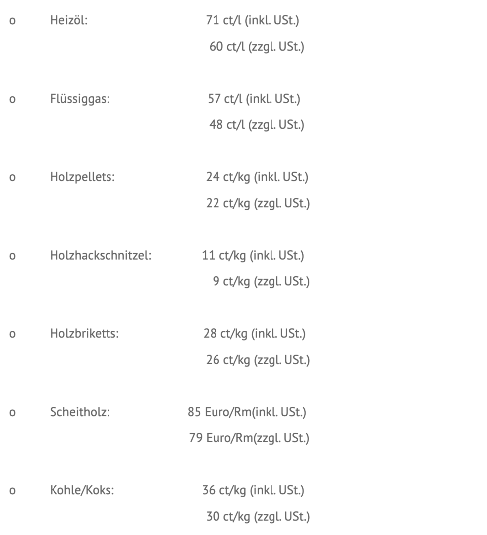 Folgende Energieträger sind umfasst: Heizöl, Flüssiggas (LPG), Holzpellets, Holzhackschnitzel, Holzbriketts, Scheitholz und Kohle/Koks.