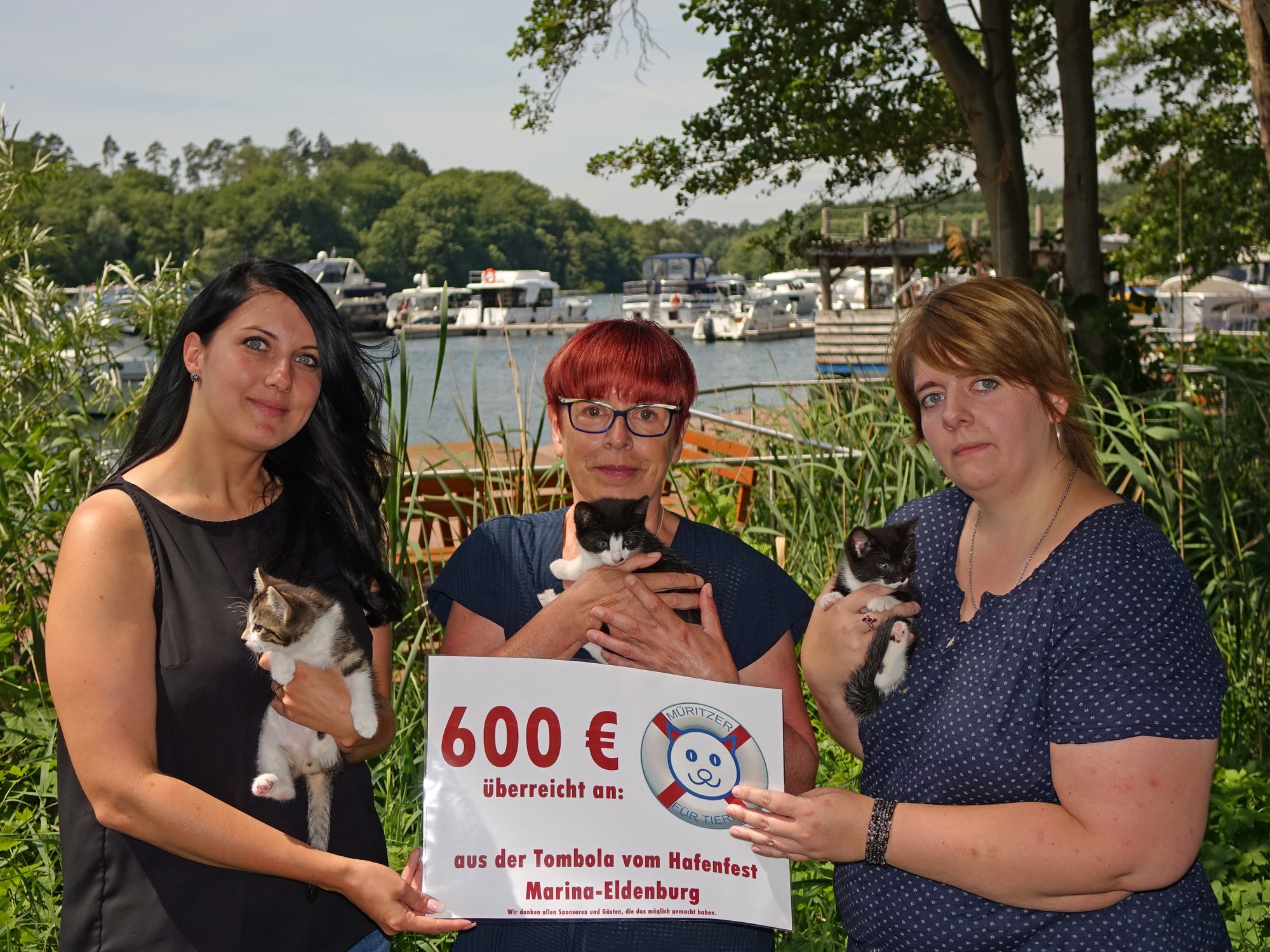 Foto: Manuela Borries von der Marina-Eldenburg, Bettina Priwitzer und Sophie Gödecker von der Initiative „Müritzer für Tiere “ sowie drei Katzenwelpen, von denen zwei noch ein Zuhause suchen bei der Geldübergabe.