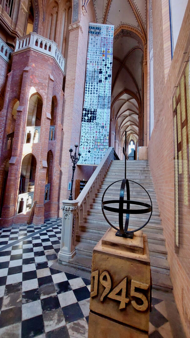 Foto im Text: Das Trauertuch mit rund 1000 Kreuzen für die Opfer von 1945, so wie es jetzt in der Kirche in Demmin hängt.
