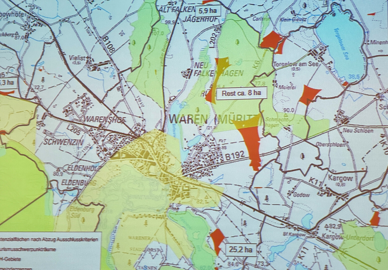 Für die Region Waren blieben danach nur die gut 76 Hektar vor dem Schmachthägener Wald übrig – und zwar links und rechts der B 192. Weitere in Frage kommenden Flächen liegen bei Falkenhagen und an der Feisneck. Die sind einer Richtlinie zufolge aber zu klein, denn die Windparks sollten mindestens 35 Hektar groß sein. Also bleiben die Acker am Schmachthägener Wald. Dort würden die Windräder laut Planungsverband wie vorgeschrieben mindestens 1000 Meter von Wohn- Erholungs- Tourismus- und Grundheitseinrichtungen liegen, stören weder ein Naturschutzgebiet, den Müritz-Nationalpark, geschützte Biotope, europäische Vogelschutzgebiete, keine militärischen Liegenschaften und auch keine Flugplätze, um nur einige der Kriterien, die berücksichtigt werden müssen, zu nennen.